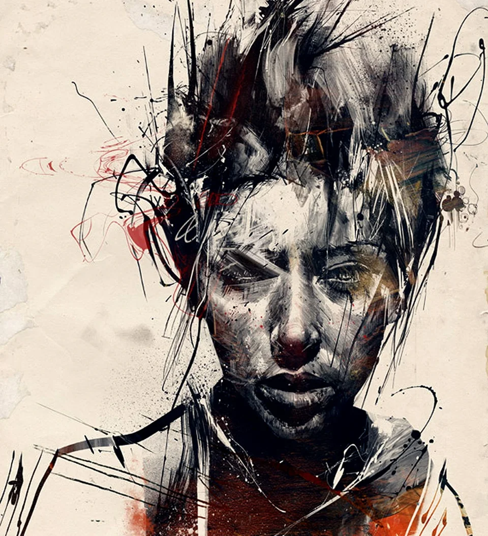 Russ Mills noto con il nome di Byroglyphics, significato della tecnica che usa, ovvero la biro, l’inchiostro di una semplice Bic su carta. Questa è infatti la prima fase di ogni sua creazione, che prevede la realizzazione di uno schizzo, poi scansionato, rilavorato con Photoshop, infine trasferito su tela.