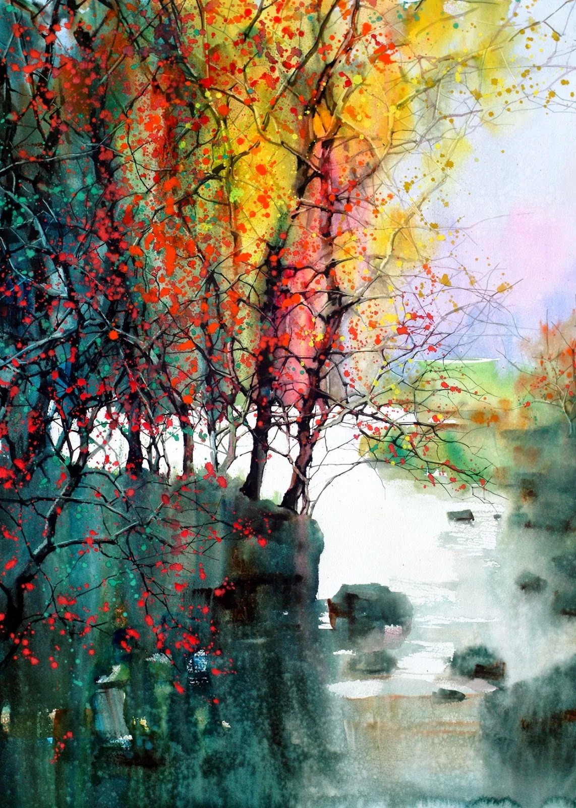 Il maestro Feng è specializzato in ritratti e paesaggi, ma sono soprattutto questi ultimi che sembrano dipinti da una miracolosa pioggia colorata.