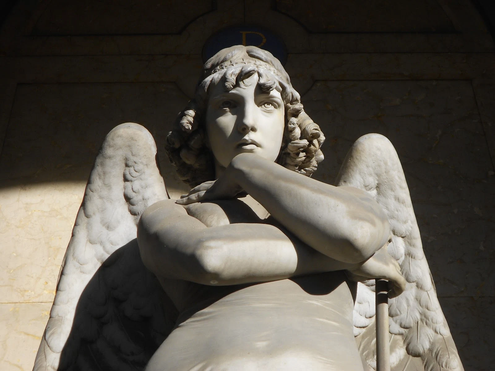 Portraying a pensive angel with long, richly detailed wings, it is acknowledged as one of the most beautiful and sensual sculptures in its genre, to which Monteverde contributed other important Neoclassical works.