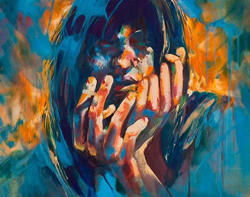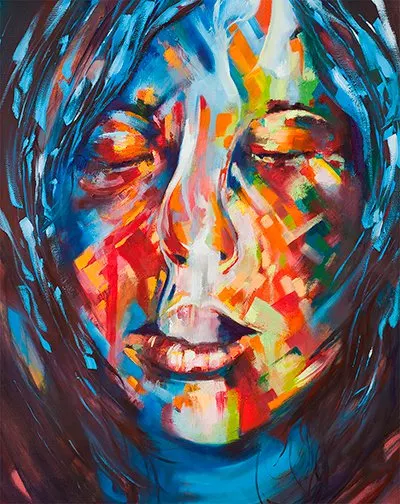 The technique that Jose Rivas uses for this series involves a series of short, multicolored brush strokes that look similar to smudges.