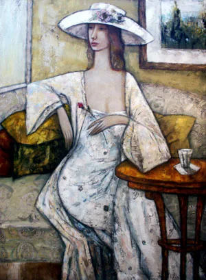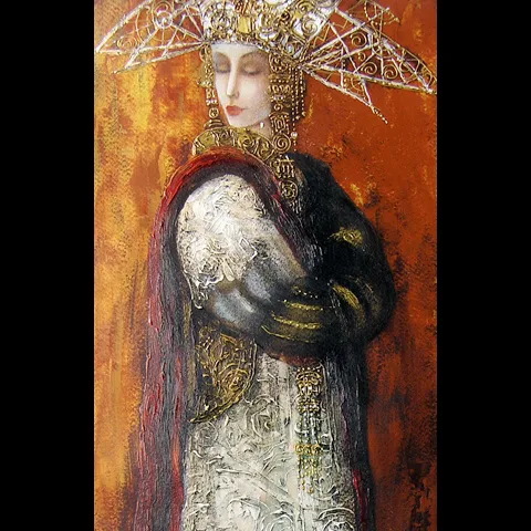 Ludmila Curilova is an Moldovan painter. Curilova's work is influenced by illusory theatre art and it retains the decorative quality of a fairy tale setting. Within her paintings on paper and canvas, warm, rich colors glow with an almost magical essence. At times her figures exist in a subdued dreamscape amidst fruit and flowers. While Curilova uses traditional media and tools: acrylic paint, brushes and art knive, she also experiments with small clay sculptures.