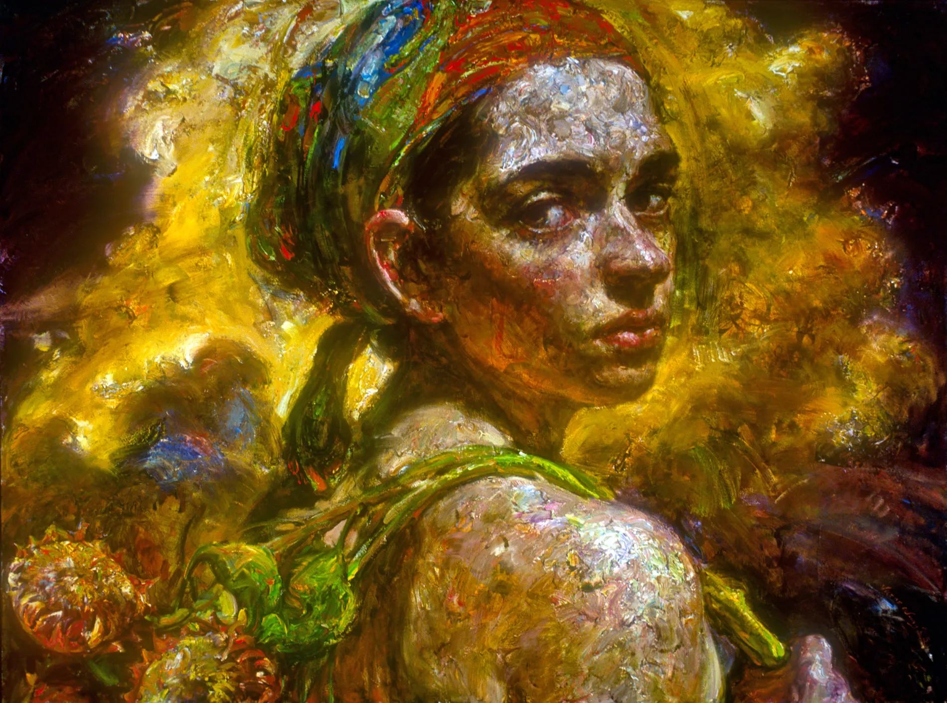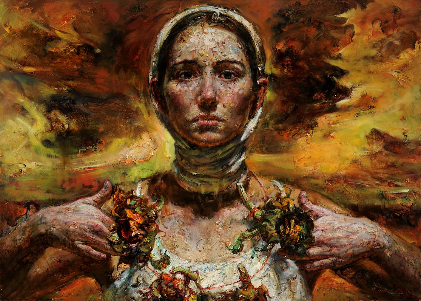 He is best known for his blend of luminous color and buttery texture that evoke the enigmatic environment where moments of meditation originate. He uses profusely colored, thickly texturized, monumental portraits of expressive western women invariably accompanied by sunflower plant motifs representing memories from his rural upbringing.