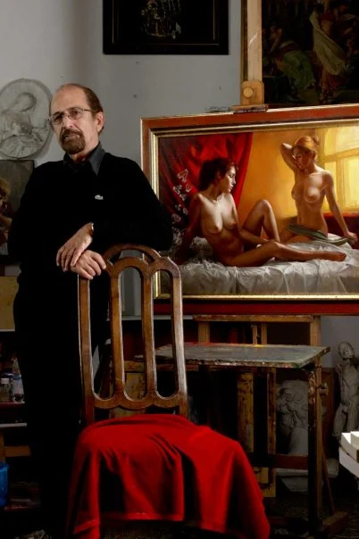 The originality of his vision is seen in the sumptuous subject matter, the quality of his chiaroscuro and the dramatic light effect on the figures and objects in his paintings. His work is happy, carnal, rich in colour and vibrant with light. In addition to paintings, his artistic training extends to sculpture, engraving, excellent watercolours as well as astounding trompe l’oeil mural paintings. His works can be found in private and public collections in Europe, Japan, Australia and in the United States.