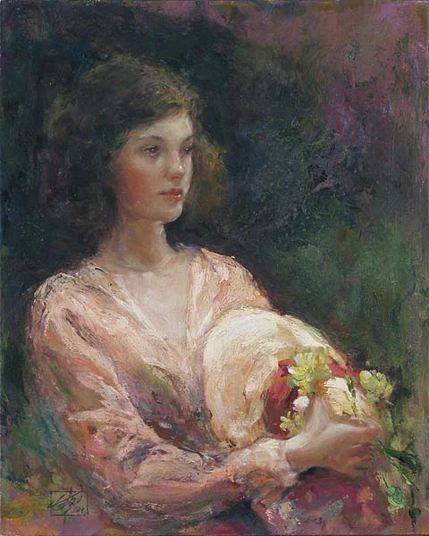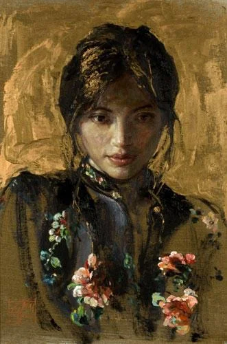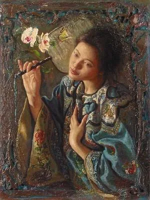 His models always dressed in exquisite beautiful silk gowns from the artist’s own collection of 20 authentic imperial dresses and posed in romantic, luxurious surroundings with a variety of antiques, artifacts, jewelry, and exotic landscapes and birds… George doesn’t pretend to be painting the real thing but draws us into a fantasy where the signs of subterfuge are plain to see, as the artist describes: these pieces “employ a dual technique of painting and sculpture that is traditionally ornate yet abstract in the most modern sense".