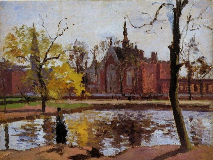 Pissarro lived in south London for a time and painted scenes, such as The Crystal Palace, London (1871), of the newly emerging suburbs there. Many years later, he wrote: "Monet and I were very enthusiastic over the London landscapes. Monet worked in the parks, while I, living in Lower Norwood, at that time a charming suburb, studied the effects of fog, snow, and springtime".
