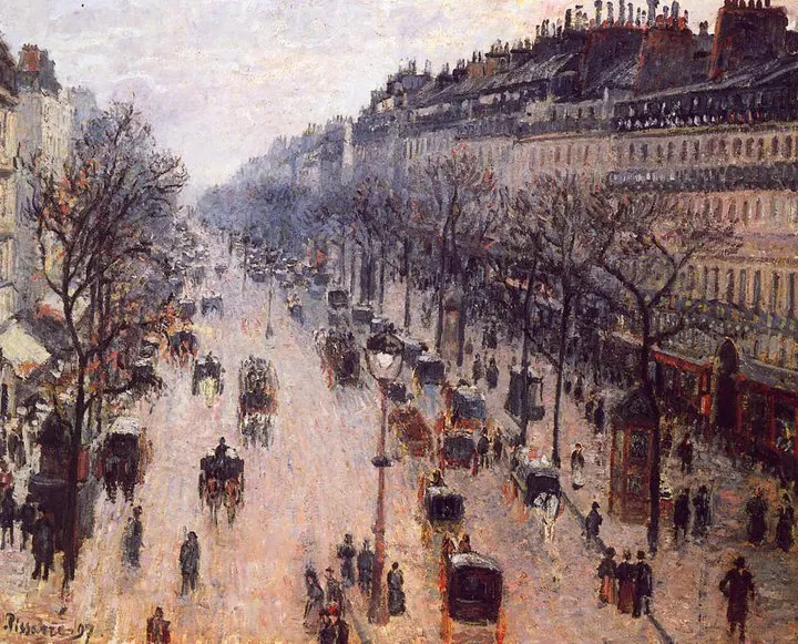 Il repertorio pittorico di Pissarro dunque si arricchisce di prospettive dinamiche di boulevard, piazze, fiumi e ponti, nel tentativo di sublimare in arte l'animata e vibrante vita urbana della ville lumière.