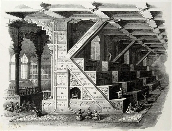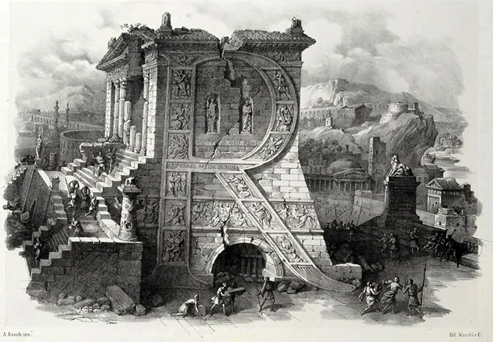 Typical of his designs, merging art and erudition, he later created 26 vignette compositions, depicting an archeologic alphabet in form of watercolors, called his Alfabeto pittorico.