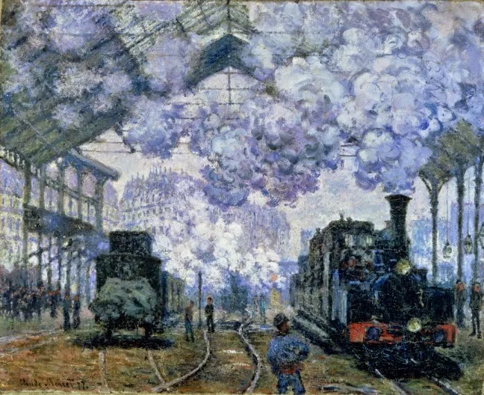 Nel 1877, dopo aver trovato un alloggio nel quartiere di Nouvelle Athènes, Claude Monet chiede il permesso di lavorare all'interno della stazione di Saint-Lazare, che rappresenta uno dei confini di detto quartiere. La stazione era senza dubbio il luogo ideale per chi era alla ricerca delle variazioni di luminosità, della mutevolezza del soggetto, delle nubi di vapore e di temi radicalmente moderni. Da ciò scaturisce una serie di pitture raffiguranti prospettive diverse tra cui alcune vedute della grande hall. Nonostante l'apparente geometria dell'architettura metallica, in questo caso, sono proprio gli effetti di colore e di luce a prevalere e ad imporsi su una descrizione dettagliata delle vetture o dei viaggiatori. Alcune zone, veri e propri esempi di pittura pura, sfociano in una visione quasi astratta. Questa tela fu apprezzata da un altro pittore della vita moderna, Gustave Caillebotte, la cui produzione è molto spesso situata agli antipodi rispetto a quella di Monet. | © Musée d'Orsay