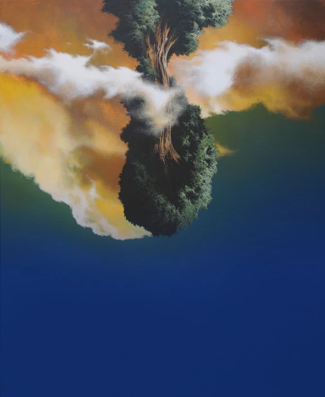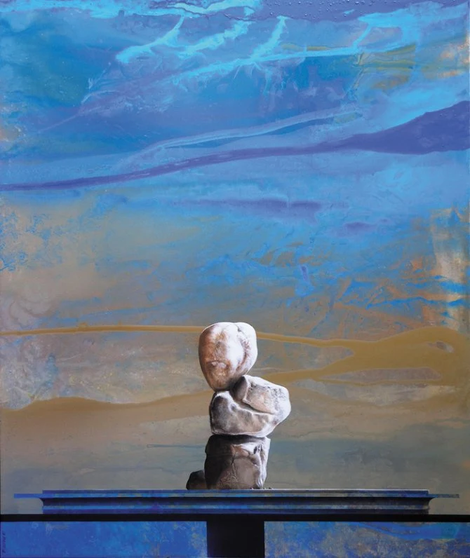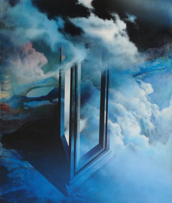 Raffaello Ossola, Swiss painter, was born in Locarno, Switzerland and lived in Italy since 1990. Ossola uses acrylic and has a distinctive style that incorporates elements such as architecture, pools, clouds, rocks, shrubs, and obelisks in surreal landscapes. His style uses characteristic light reflections and projections.