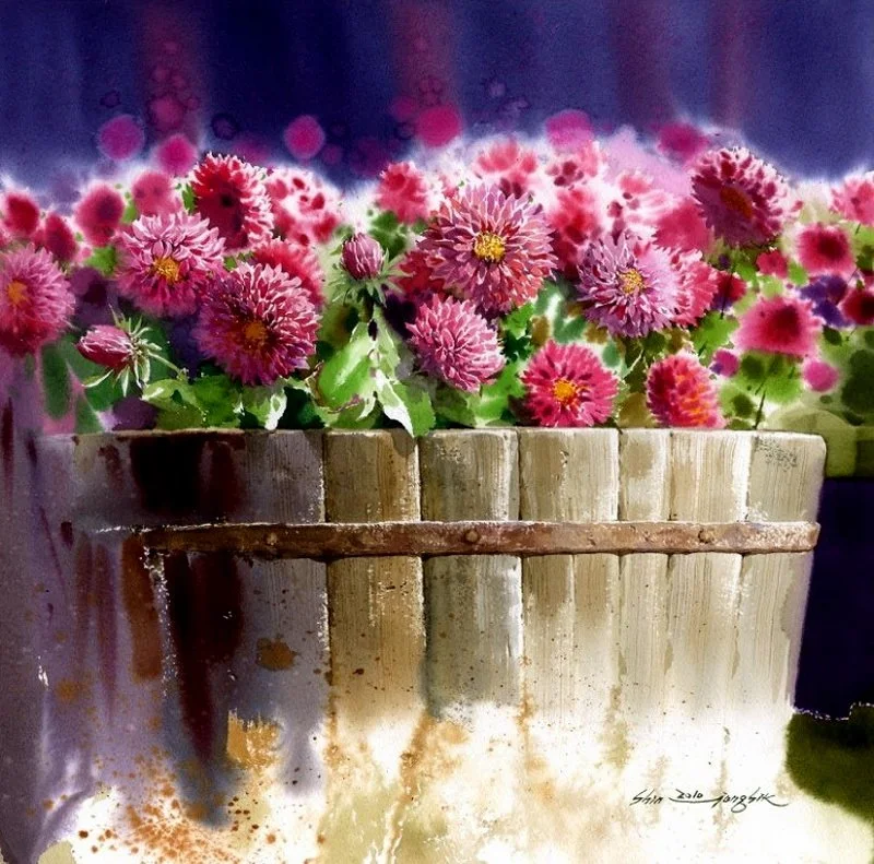 L'acquarellista Coreano Shin Jong Sik è famoso per esprimere colori puliti e trasparenti ed i suoi dipinti di nature morte esprimono sentimenti colorati, dignitosi e profondi.