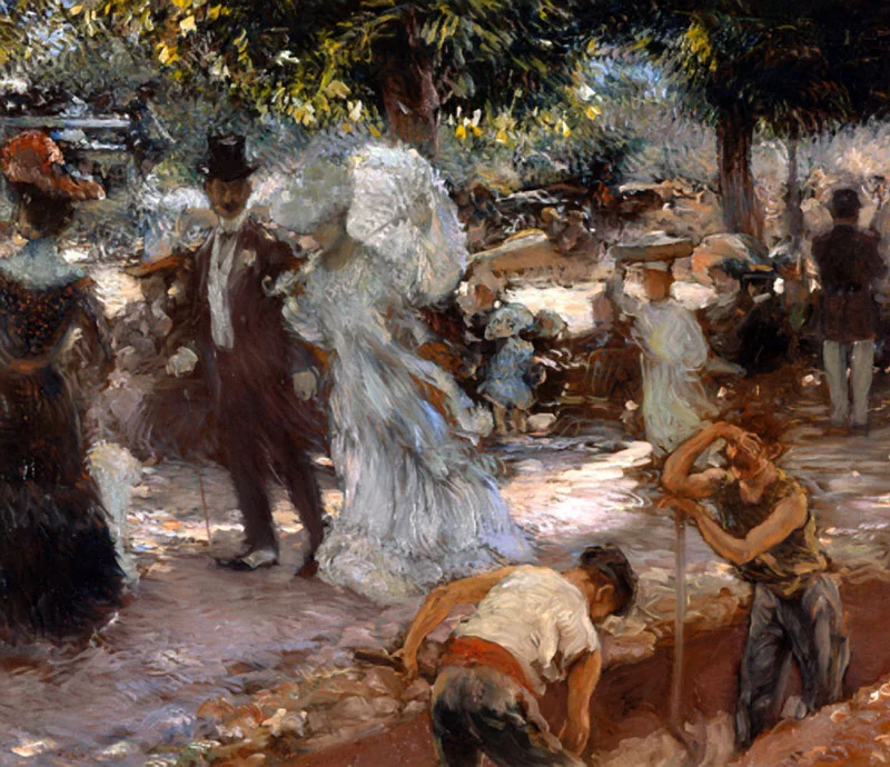 In this scene, reminiscent of 17th-century fêtes-galantes, several women in colorful dress are relaxing in a park, either at Versailles or St.-Cloud.