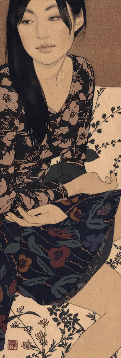 Using a Menso brush, mineral pigments, and soot ink on linen cloth, Yasunari continues the ancient tradition of Nihonga painting while simultaneously bringing modern elements to play, such as present-day clothing styles and floral textile designs.