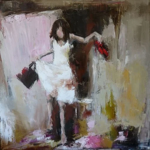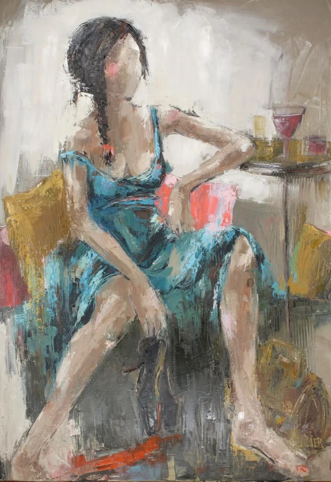Painting is my oxygen!” as she says. With all her determination, she puts all of her emotionality, strength and requirement into her work, making “the Other One” in her surfacing through a hinted vision, catching with talent the ambiance of a scene, the colour of the feelings and the true essence of her characters during the ephemeral moments of their movements or attitudes. Her works mostly stage female characters.