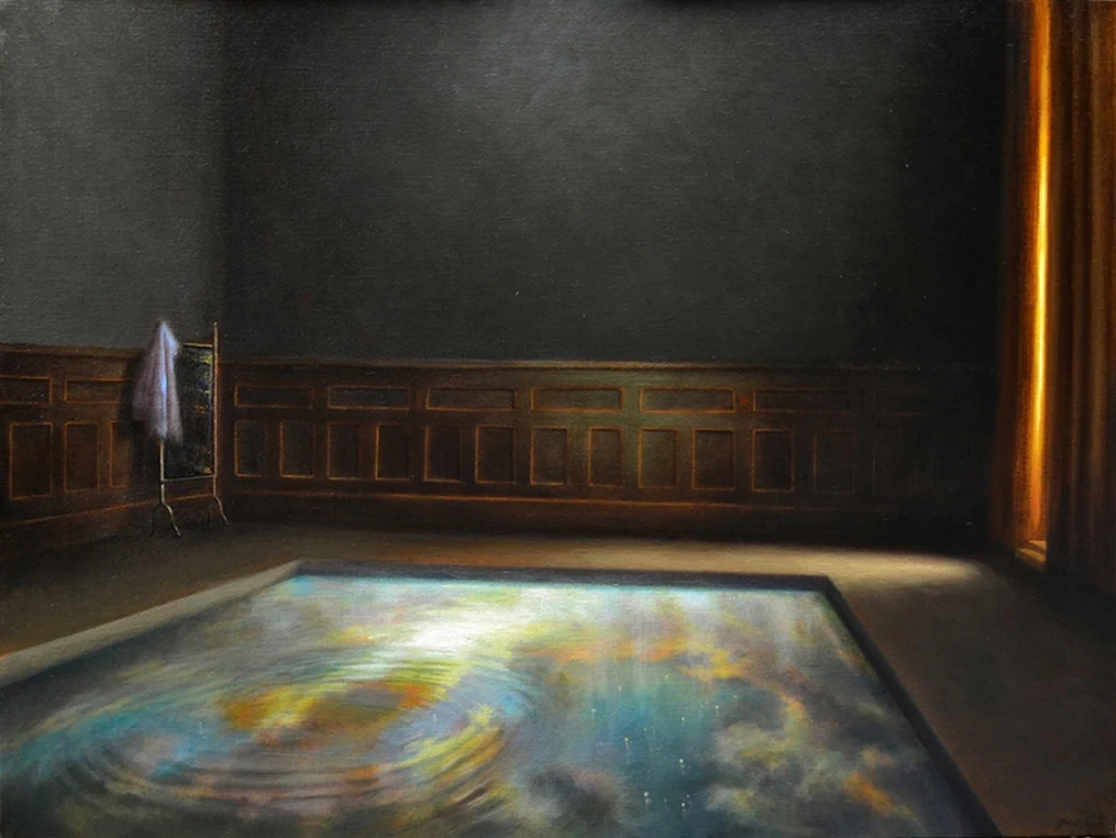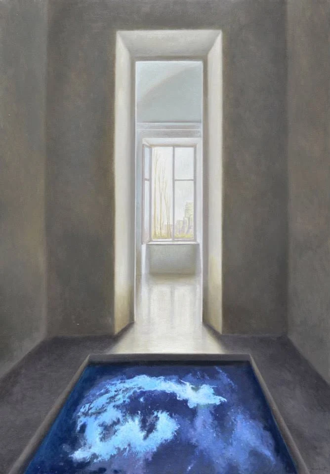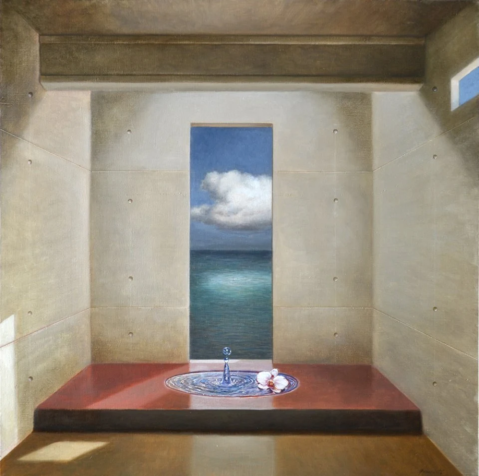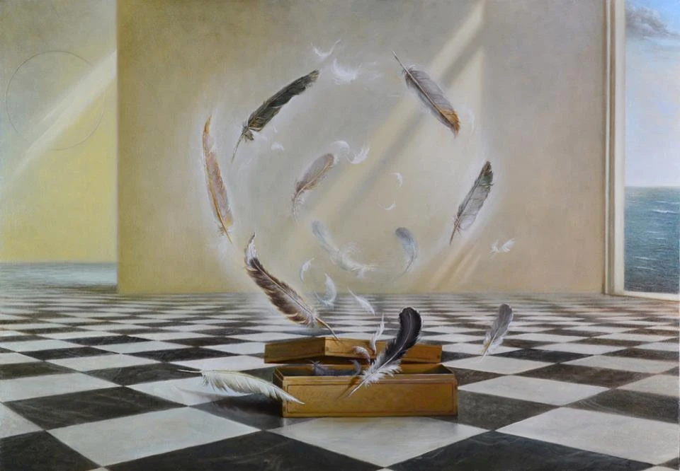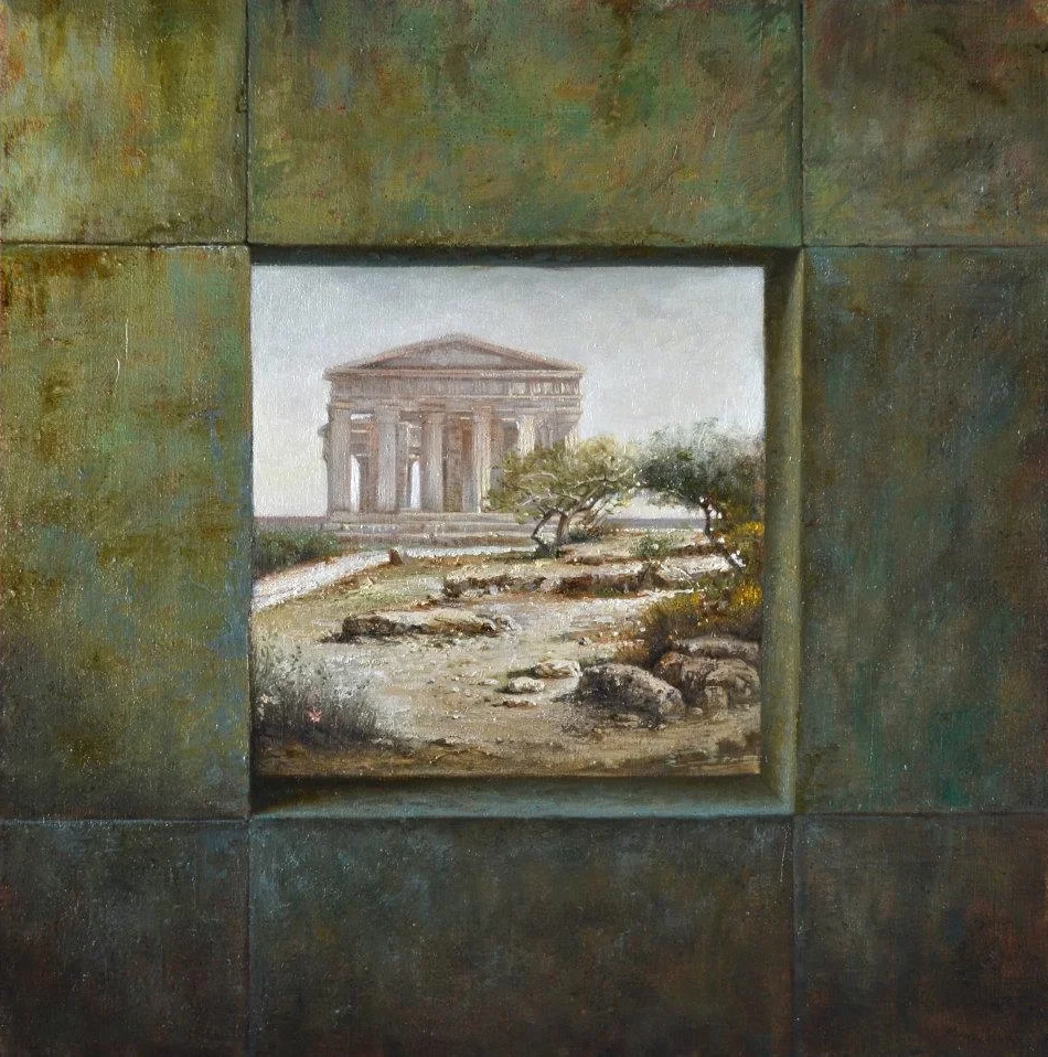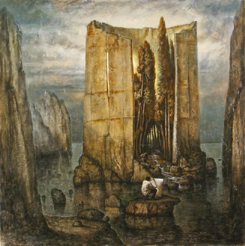 Elements that were to become some of the constants in his work emerged: Metaphysics, Symbolism and Romanticism. That’s the period of “Farmacie Italia”, “Le stanze”, “Gli oggetti” and appears in “The isle od the dead” of Arnold Böcklin, a masterpiece which Nunziante will turn into an isle of love as an ideal space for mind and spirit. Simultaneously he exhibited in Florence, and afterwards in Lugano and Venice twice. The new millenium starts with the painting “Dimensioni parallele”, exhibiting in 2001 at the Boussex-Meaux museum in Paris, on the occasion of the exhibition “Hommage a l’Ile Des Morts”, together with works of Salvador Dalì and Max Ernst.