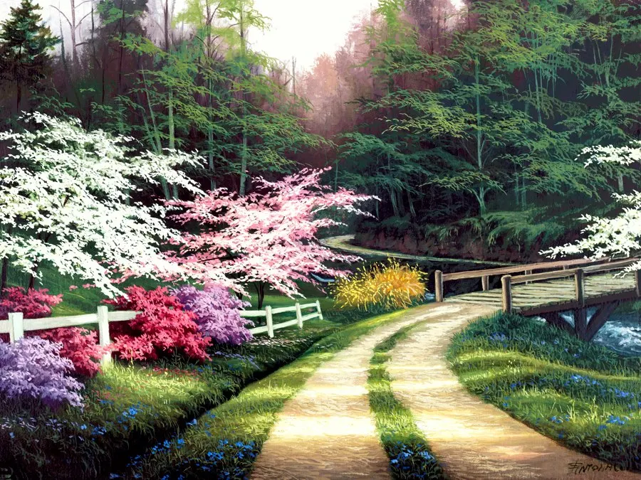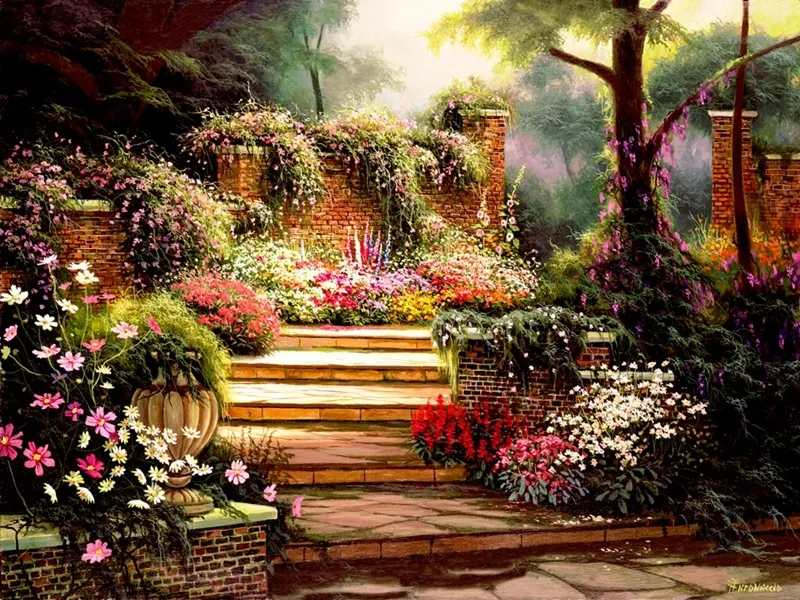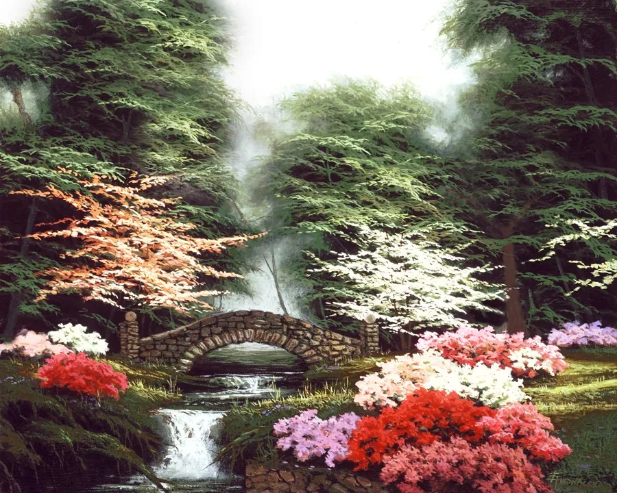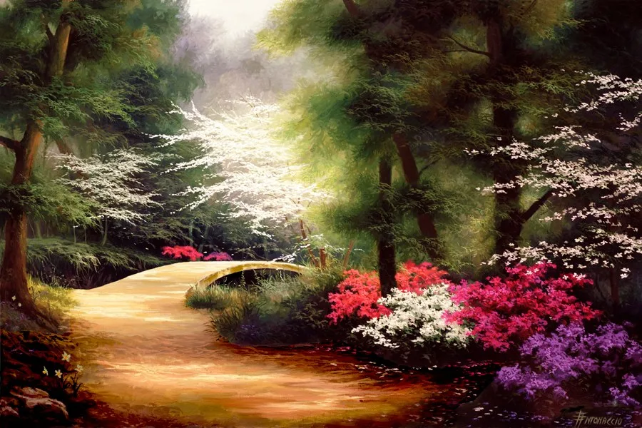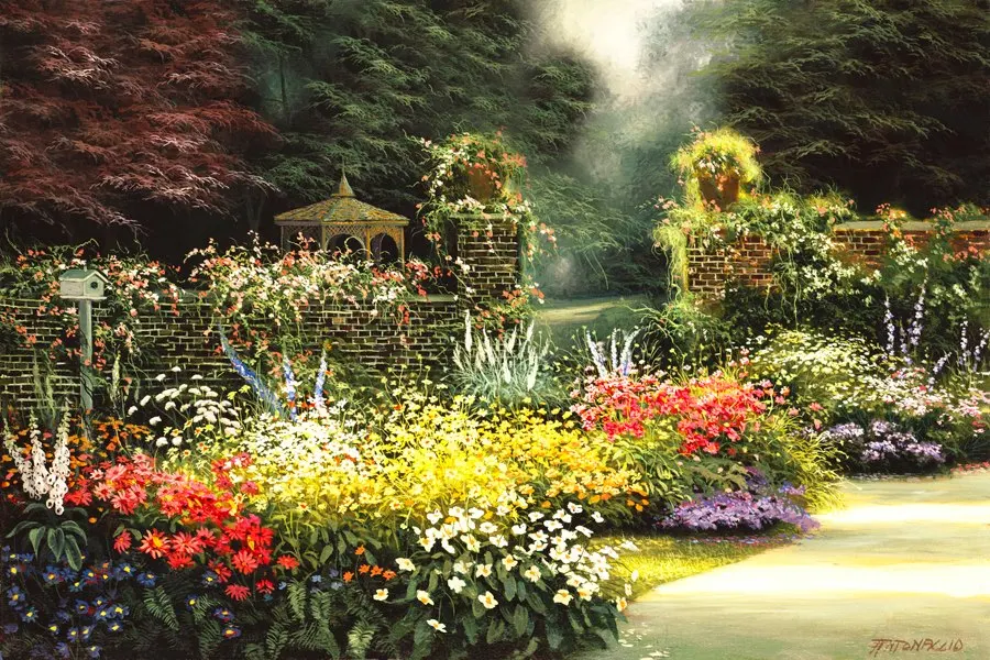 In 1981, Antonaccio came to the United States and made North Carolina his home. The mountains sunlit valleys and shadowy hillsides have become the inexhaustible source of inspiration for the artist. Nationwide, Antonaccio is mostly known for his floral landscapes, the themes of which vary from the elegance of the garden in a secluded estate to the simplicity of a path with dogwood trees and azalea bushes. His technique is light and delicate and his themes are romantic and gentle; each painting evokes feelings of strength, grace and wonderment. From floral gardens, richly foliaged and filled with summer scents, to vast panoramic views of hillsides and valleys, Antonaccio is multi-talented with ingenious imagination.