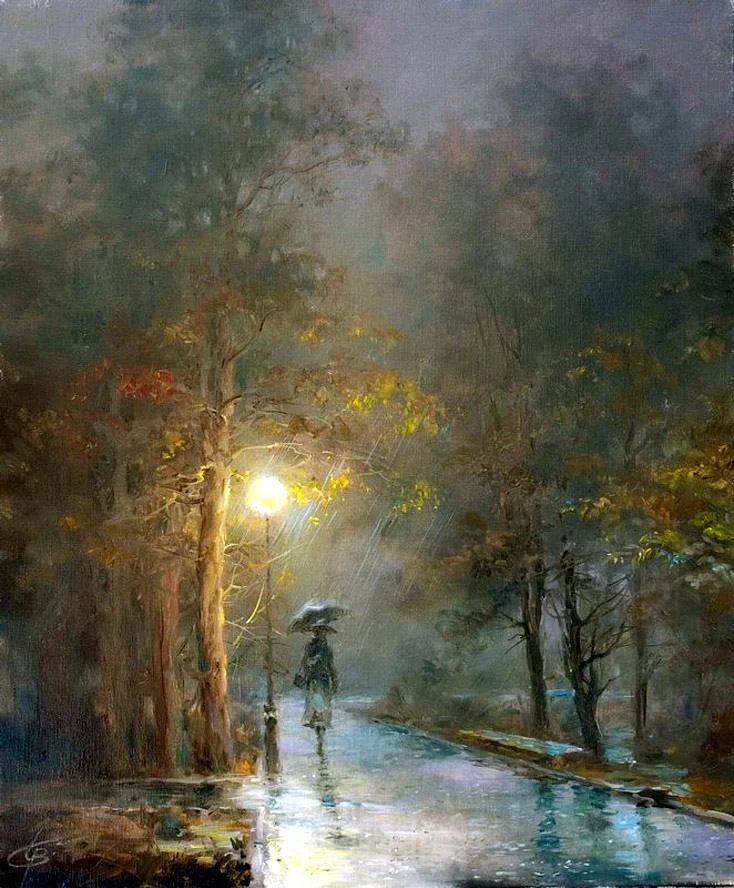 His realistic paintings really drag your view, making you feel hypnotised by their beauty, mystery, making you feel like you are in the place the artist has immortalised on the canvas, making you unsure if you have been there before in a dream or a previous life. His landscape art have the unique property of wanting to completely immerse yourself in it. The artist masterfully showcases the atmosphere of his inner world, thoughts, experiences and secrets. He sees the beauty in rain drops, the warmth of the night, lone khutor, lost in a beautiful corner, on a road taking the traveler into the unknown. “I prefer to draw clouds than the blue sky. Autumn, rain, sometimes the sun - that’s my mood and I like it” - the artist says.