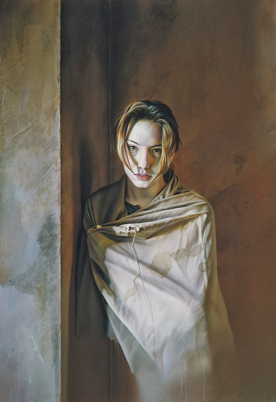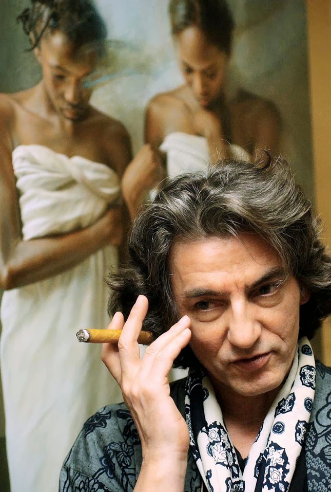 By the late eighties the subject matters were now increasingly women mixed in unusual poses with parts secluded or entirely missing. Drapery and runny paint was used as illusionary cue points to his partially disappearing parts.