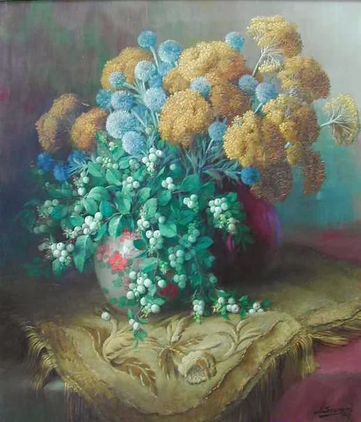 La prima mostra nel 1903. Pittore di fiori, ma anche di vedute di città e paesaggi.