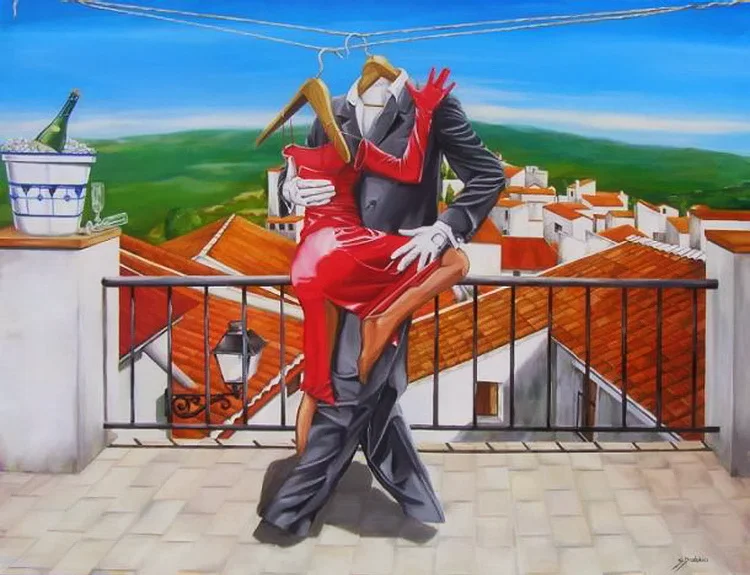 Similar to the painter Frida Kahlo, Drabkin often deals with relations between husband and wife, and the different roles given to them within the family.