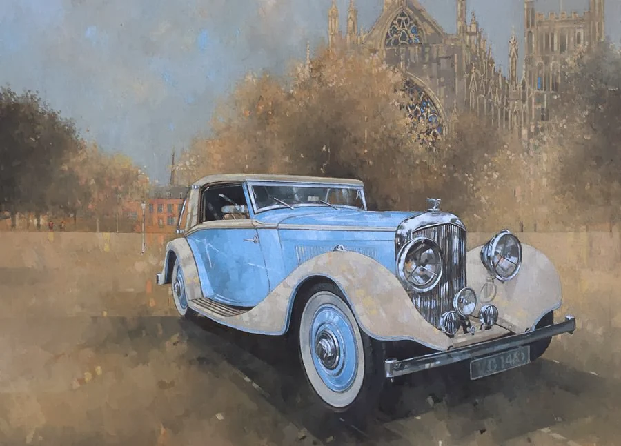 British painter* Peter Miller (1939-2014) has been inspired by the early motoring scene and the evocation of the Golden Era which it personifies. The key subject matter in this has been the Rolls-Royce and Bentley Motor Car, particularly the cars of the 1920s and 1930s. Painted with genuine feeling and creative intensity, his sole aim was to create a good painting not just a picture of a motor car. The series was originally planned as a thematic series of twenty works which eventually developed into a total of 108 oil paintings, of which eighty two were recently displayed at Gibson Moore Fine Art gallery in London. Peter Miller has exhibited at many solo exhibitions and mixed and group exhibitions.