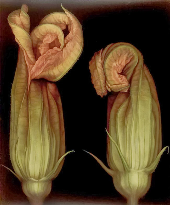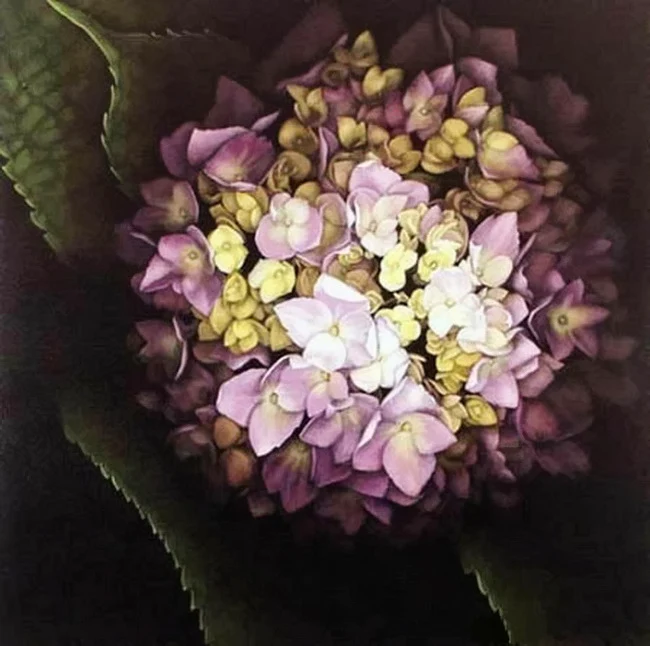 All her artwork is conceived from a sketch, which she later paints onto a large black canvas. Her delicate technique is with very thin layers of oil paint, while using the black background for shadowing. She captures every detail of her subject. For her it is all there, she just uncovers it.