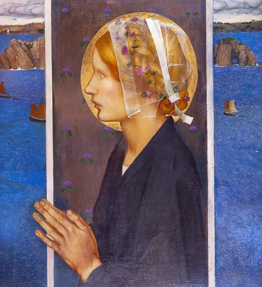 Mr. Frampton considered himself to have been influenced both by primitive Italian painting and the British Pre-Raphaelite design and also by the compositions of Pierre Puvis de Chavannes.