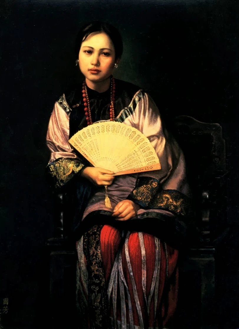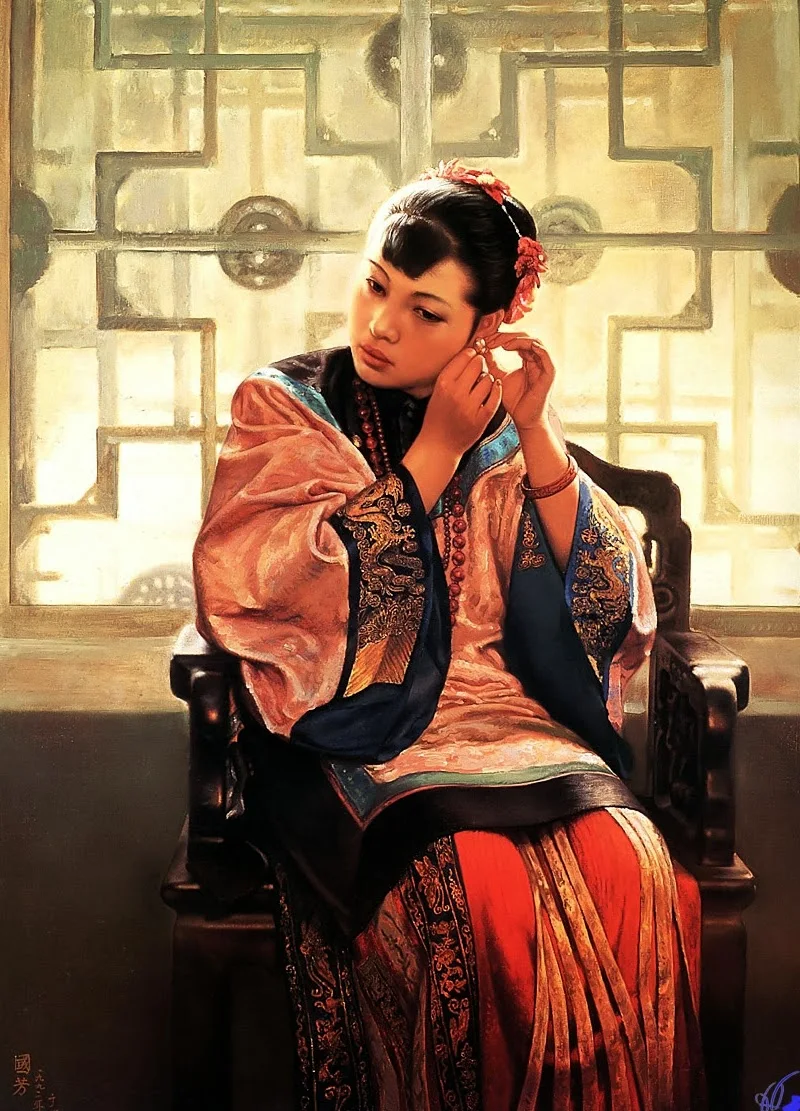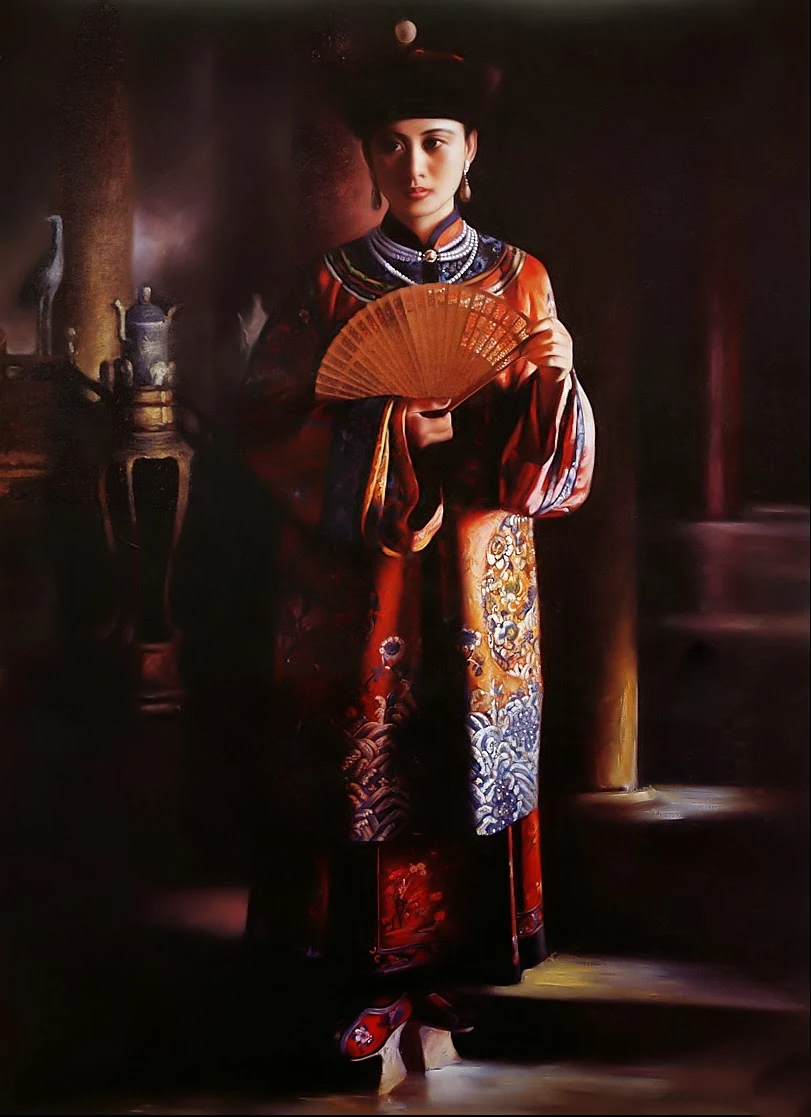 The paintings of the "Forbidden City" series, portraits and scenes from the 600 years old imperial palace, have their own unique expression due to the distinctive painting style he has developed.