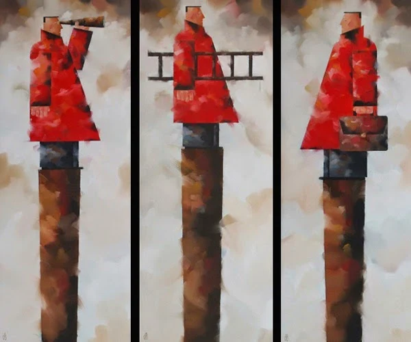 A 'space scout', a man in a rubber ring or a man looking intriguingly at a bird sitting on his finger; they all seem to be absorbed in the moment. Because the background is painted with set patterns and monochrome areas, the brightly coloured accents of, for instance, the clothing on the human figures or the little bird really stand out. Without wanting to convey a deeper meaning, the artist says that he wants to ‘depict a short story’. The lack of concern emitted from these stories is confirmed with a simple, clear and convincing use of colour.
