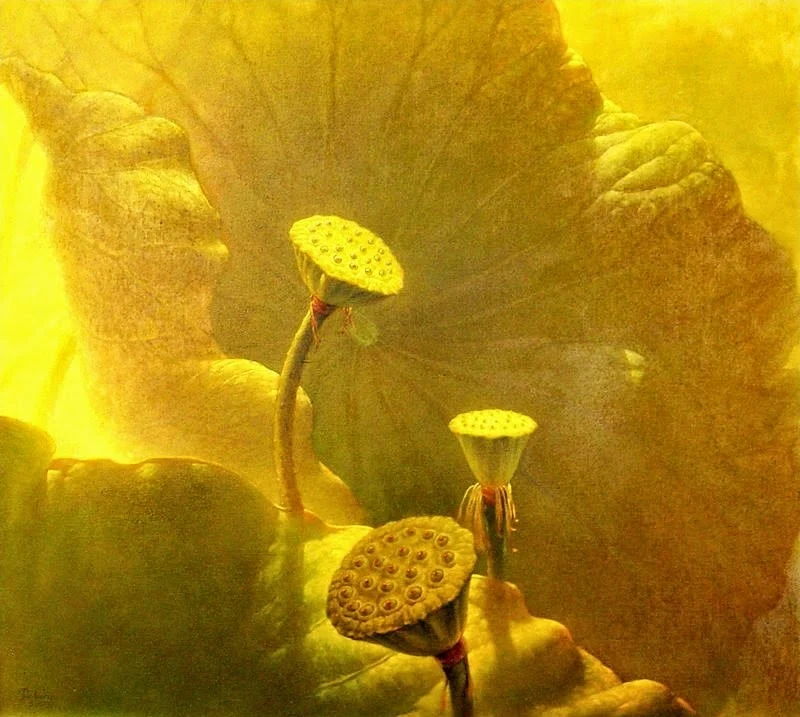 His main subject, the lotus series of works can be said to be a combination of a breakthrough from a rigorous traditional realism toward Chinese painting freehand techniques.