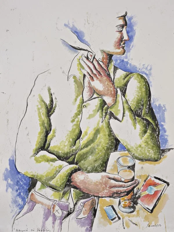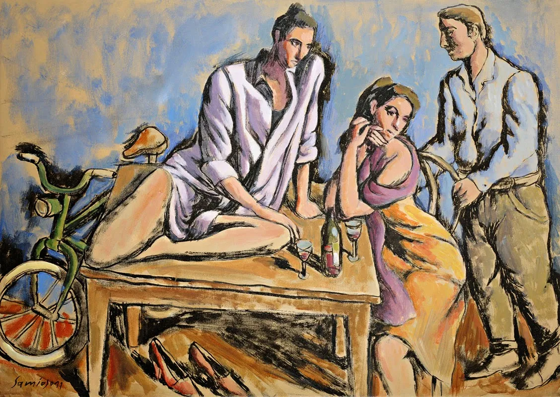 Pavlos Samios’ depictions, springing up from childhood and then personal experiences, remind us of traditional story-tellers where the Man-“Hero” plays various roles in his work just like actors do, roles that are at times amatory or exist in some kind of daydream.