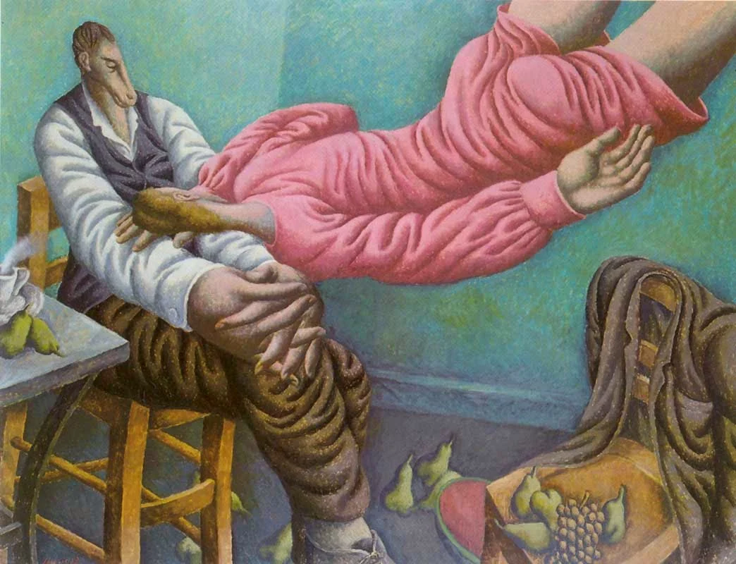 Samios esprime nei suoi dipinti una visione simbolica e metafisica.