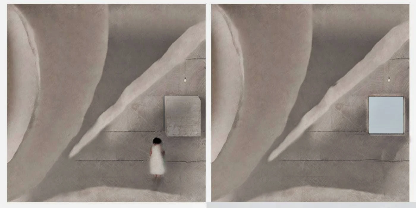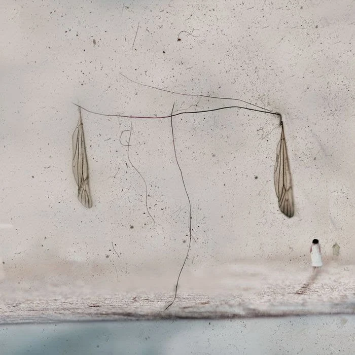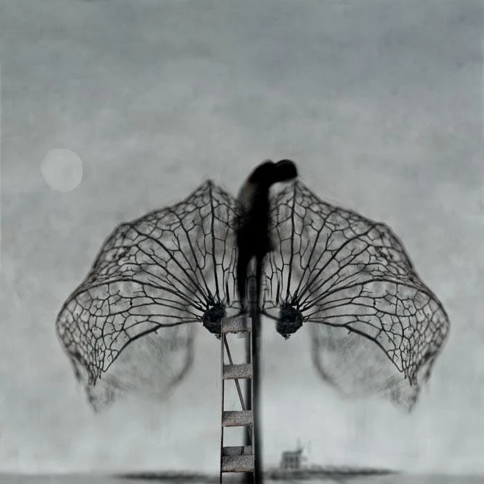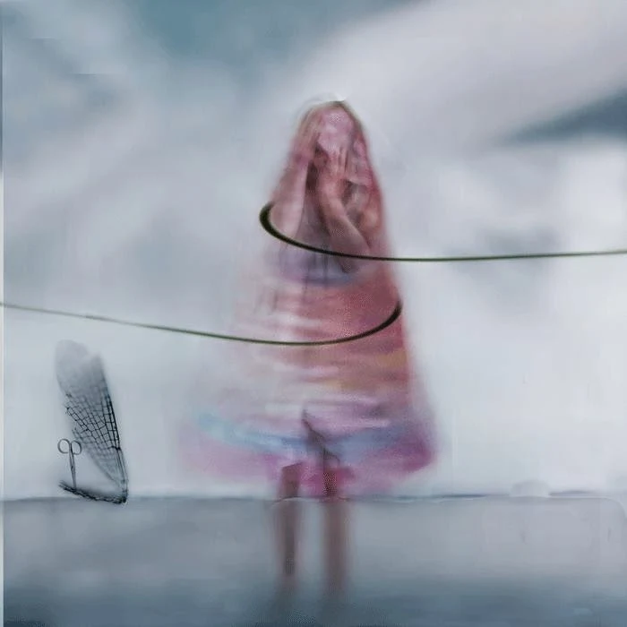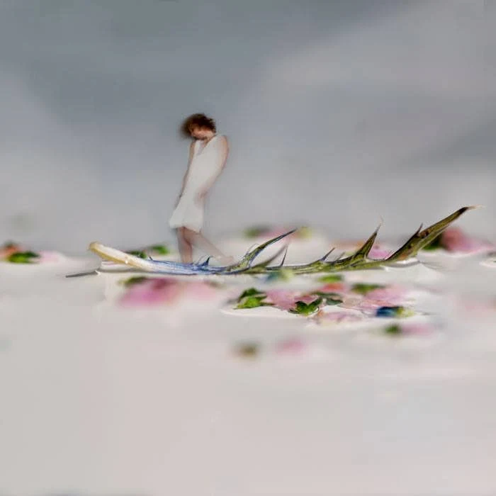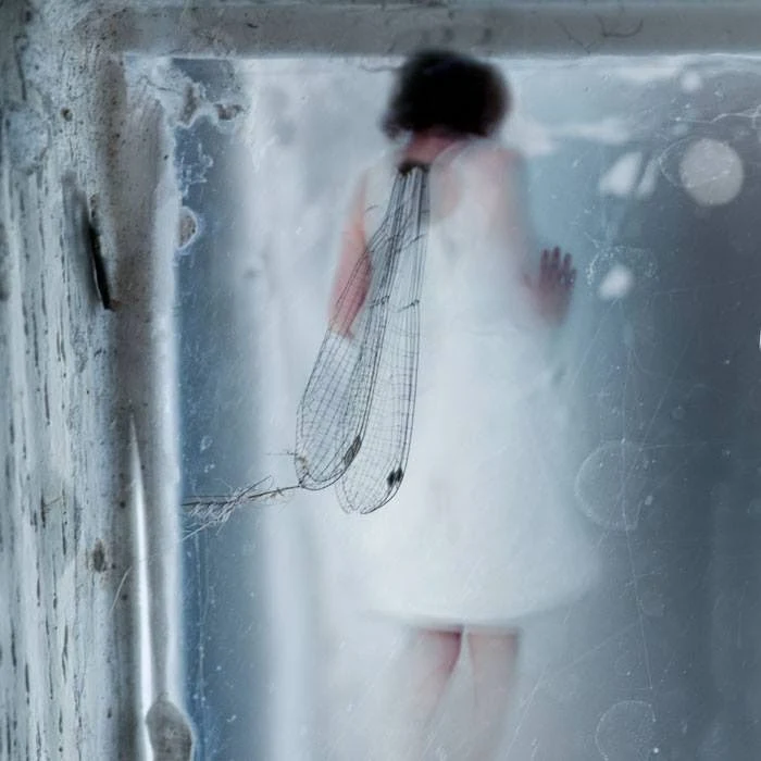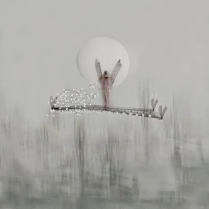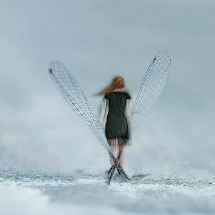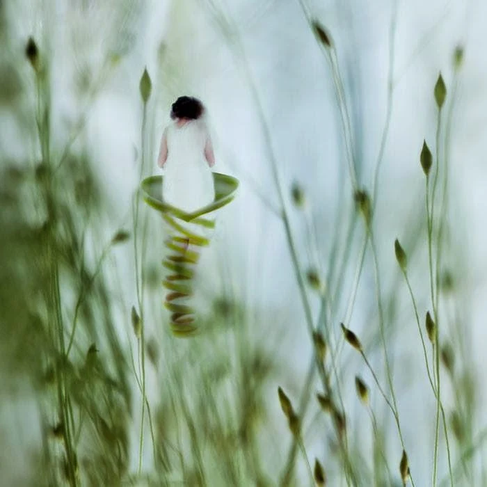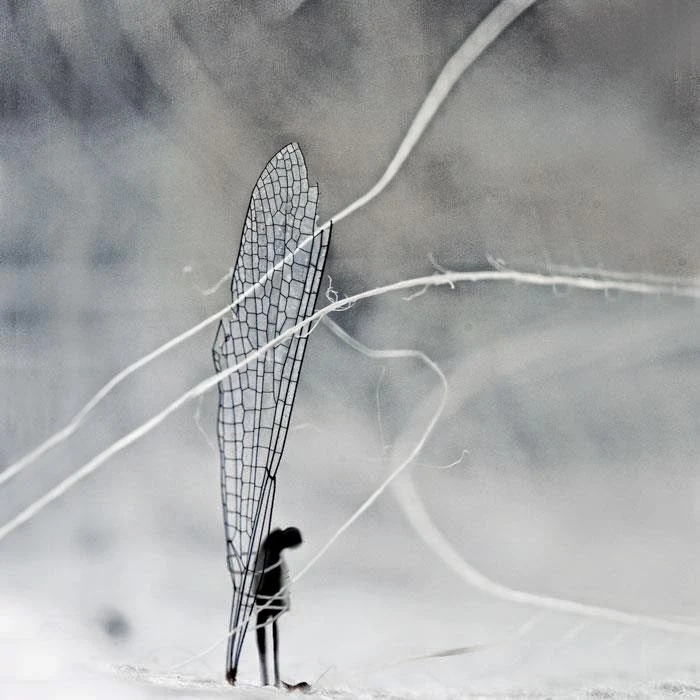 I give them a meaning. My work is mostly build up with different images. I put them together in Photoshop.Everything you see I created myself. Sometimes I ”paint” on my images or use different materials. The figures you see are mostly me… I use the self-timer.