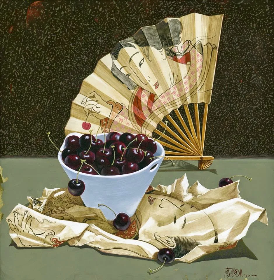 The exquisitely composed and detailed painting includes a souvenir fan, a fortune cookie, a shopping bag, a computer mouse, and other flotsam one might find in a junk drawer.