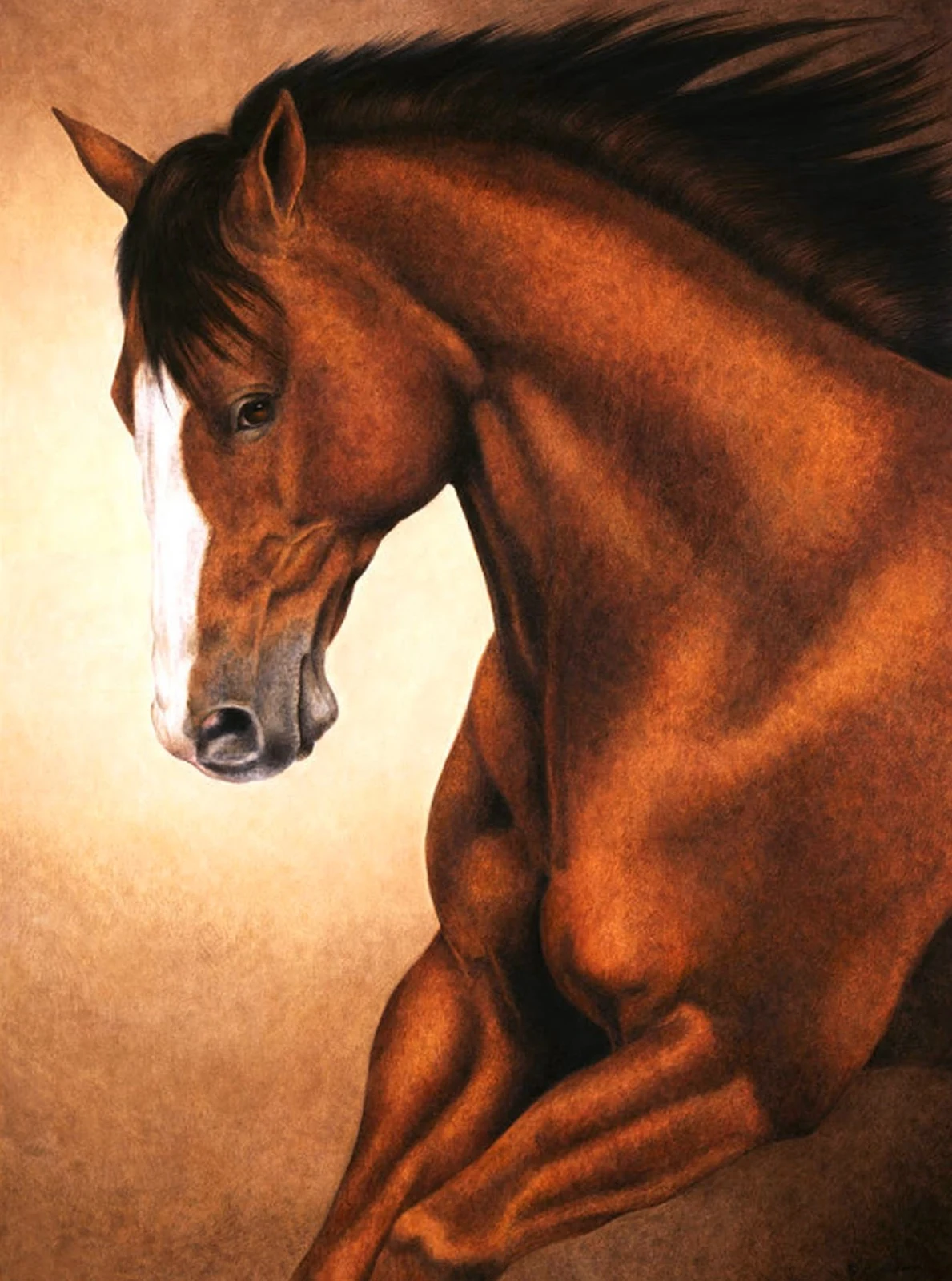 She has since re-located to the Desert Southwest. She is well known for her highly detailed portrayal of both horses and other wildlife in watercolor and prismacolor pencil.