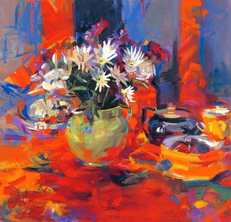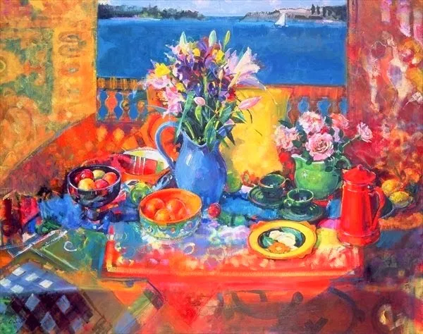 As his work develops his fascination with colour has taken the dominant role. In the winter months within his studio he delved deeply into the still life genre, creating some of his most stunning compositions, again with colour the dominant theme but reflecting the heightened sense of atmosphere and passion that comes directly from painting in the beauty of the Mediterranean.