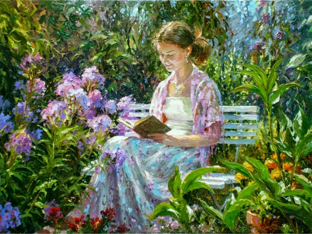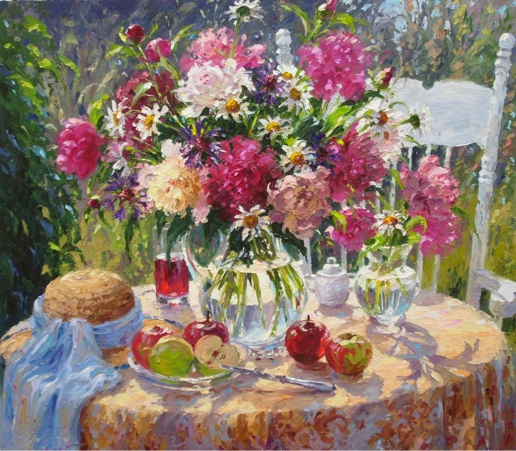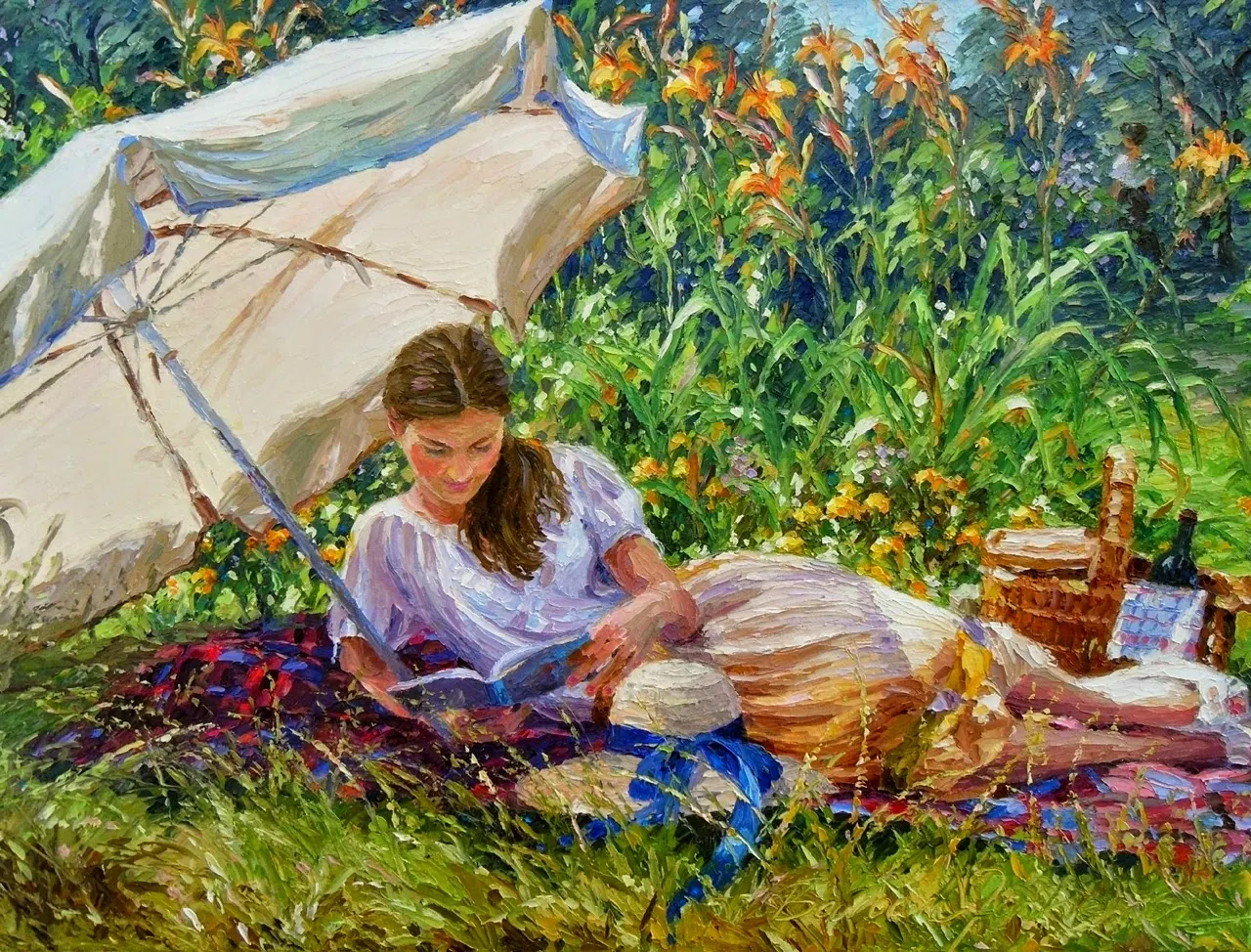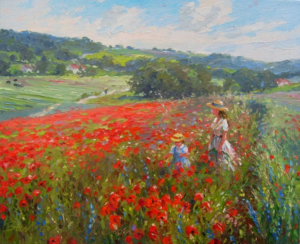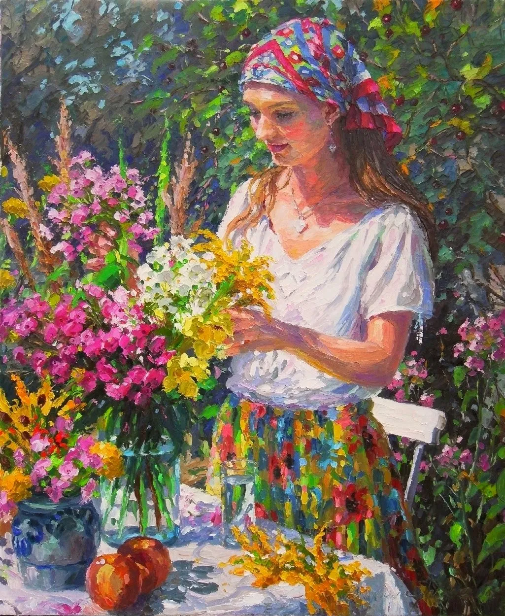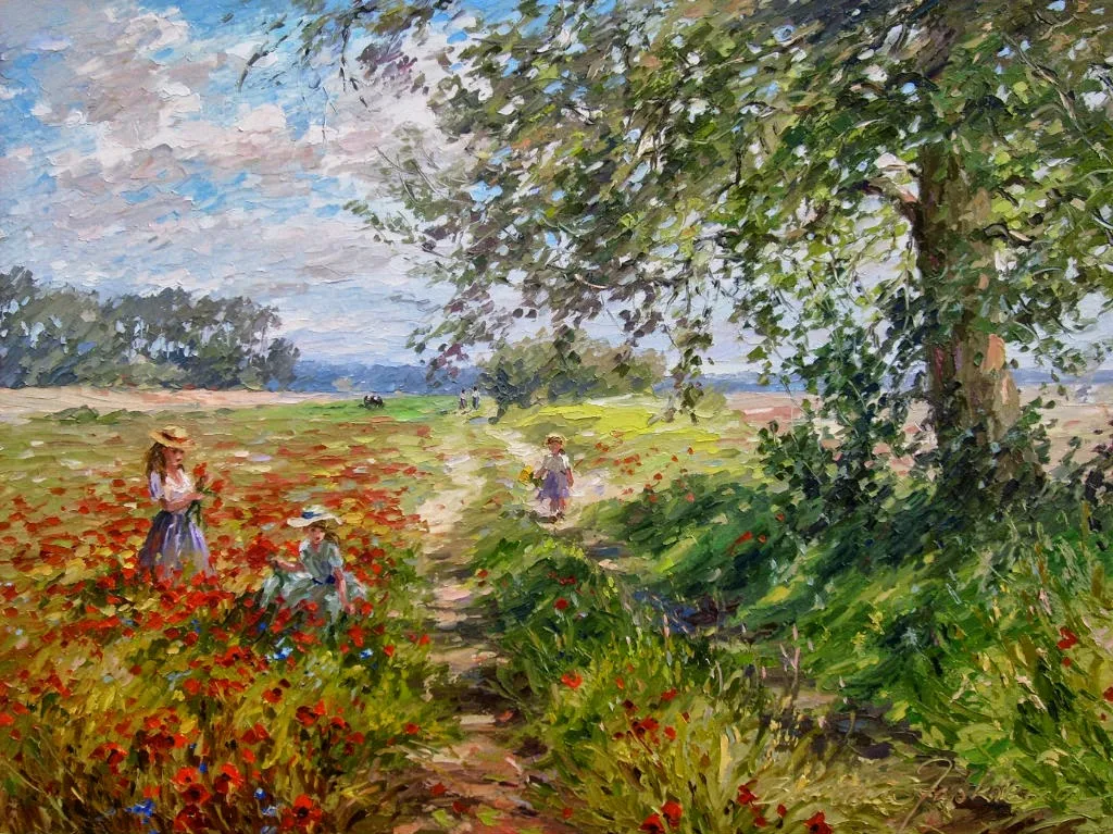 The landscape compositions are joined by genre scenes of picnics, portraits of ladies in hats and of children picking flowers. The extraordinary charm of peonies, sunflowers, roses and asters provides great inspiration for extended, delicate and elegant flower paintings. Her portraits emanate a subtle coloring and delicate modeling.