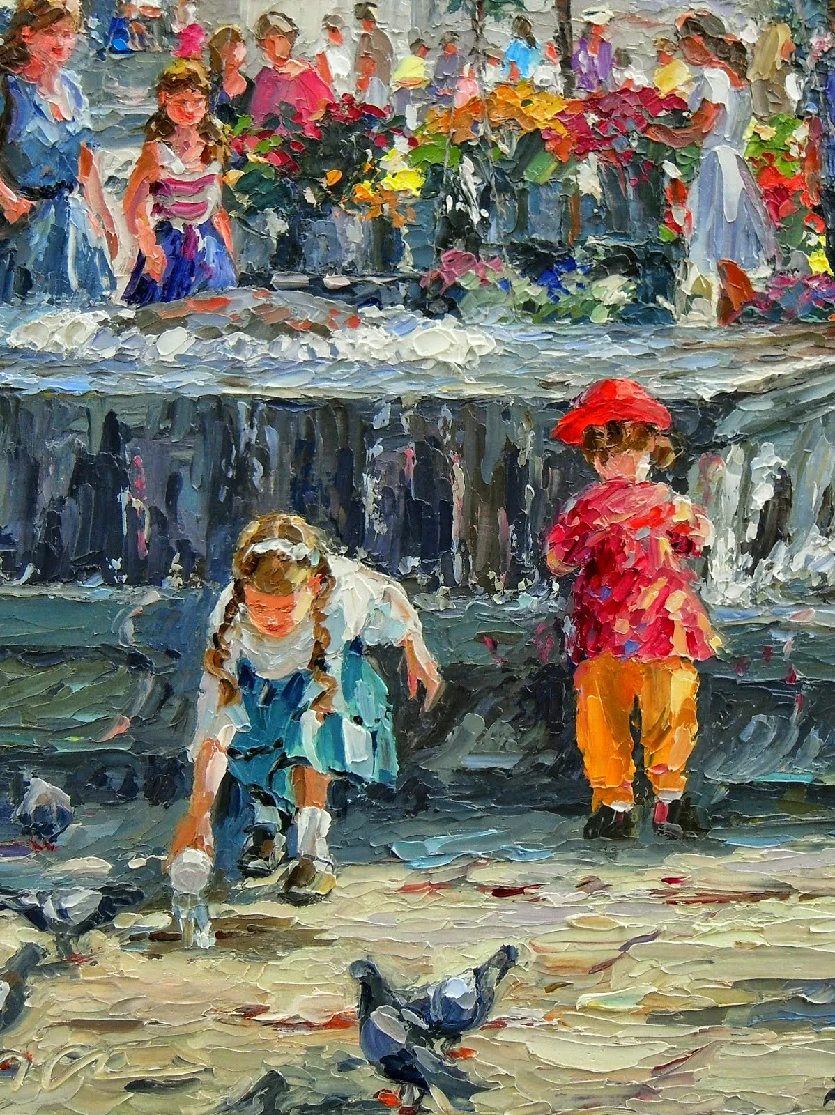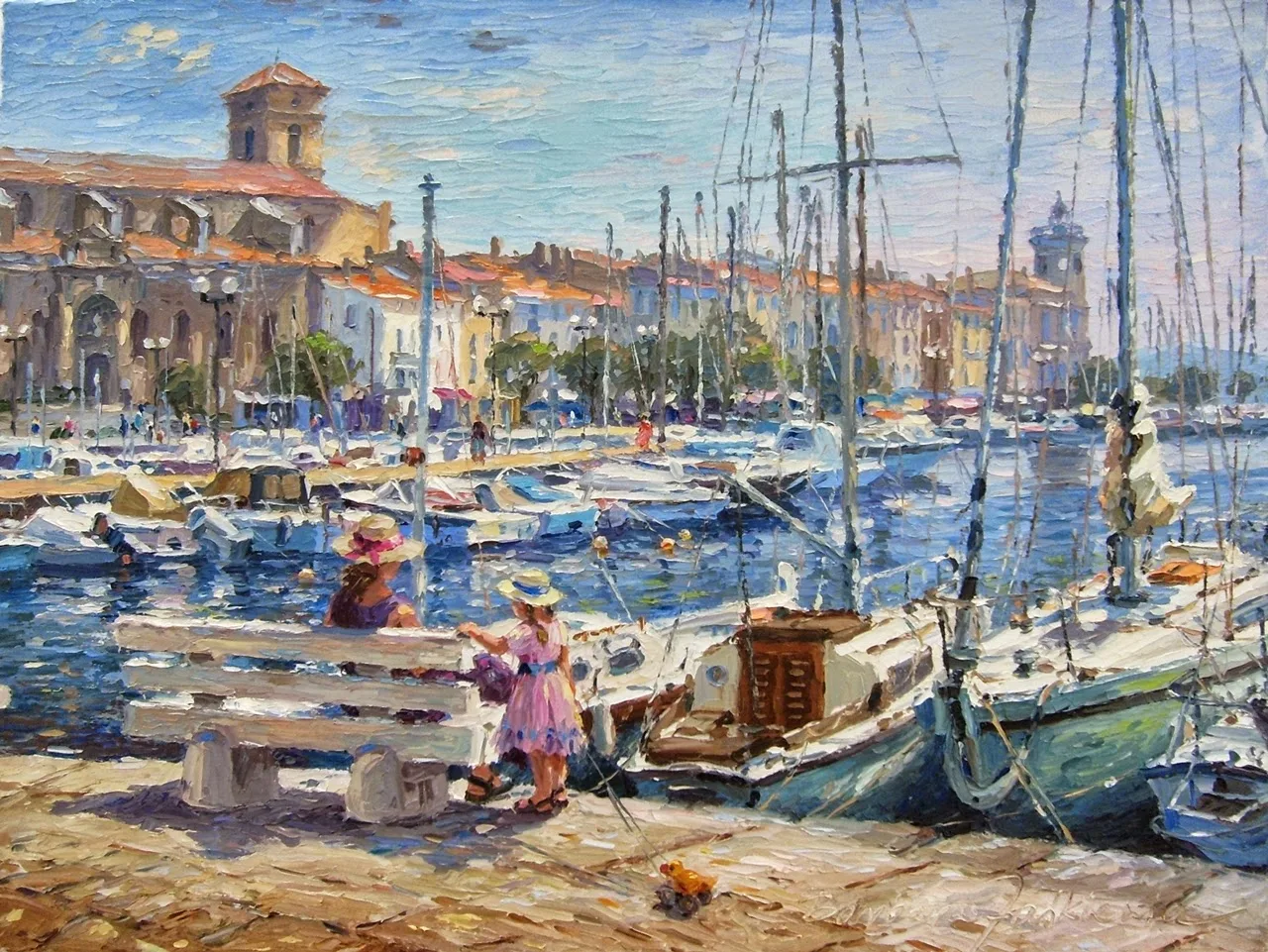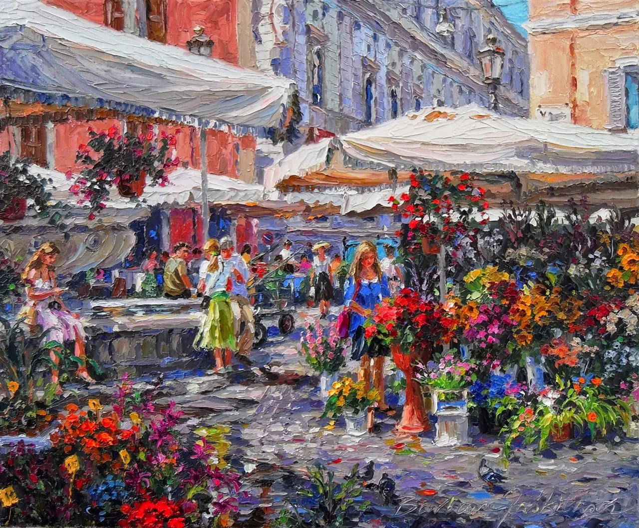 In her cityscapes, ancient Provencal towns and Mediterranean ports are portrayed most often. The crowded streets and squares of the picturesque Cracow, the bridges and canals of Venice and city scenes from Ostrow Tumski in her home town of Wroclaw are all frequent themes.