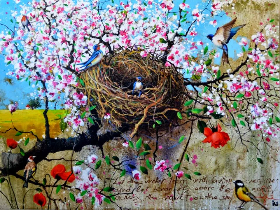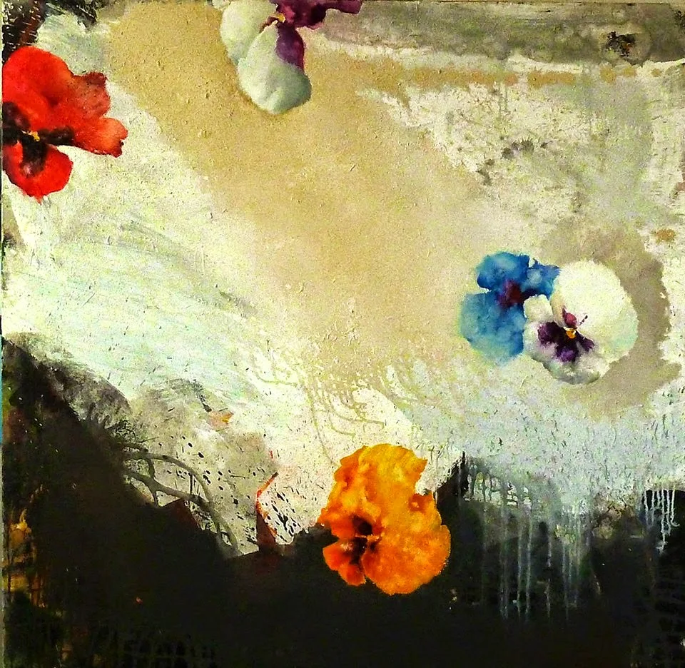 "The inspiration begins the journey of an artistic interpretation with all my belongings... Seeking a twig to rest on and touch feet on the earth, to be born. React ... I leave the thinking to spill outside the boundaries and create margins ...