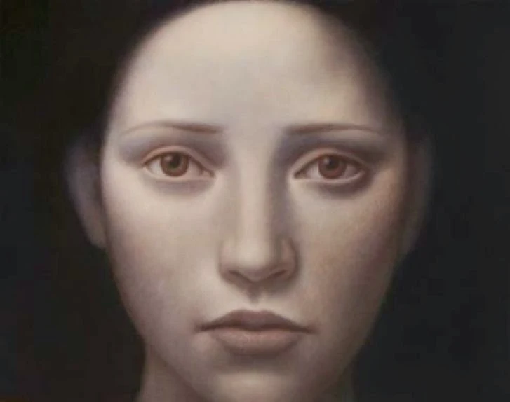 The luminosity of the face is reflected in the pristine light of the blue sky and mathematical clarity of the human form, reminiscent of 15th century Italian painter Piero.