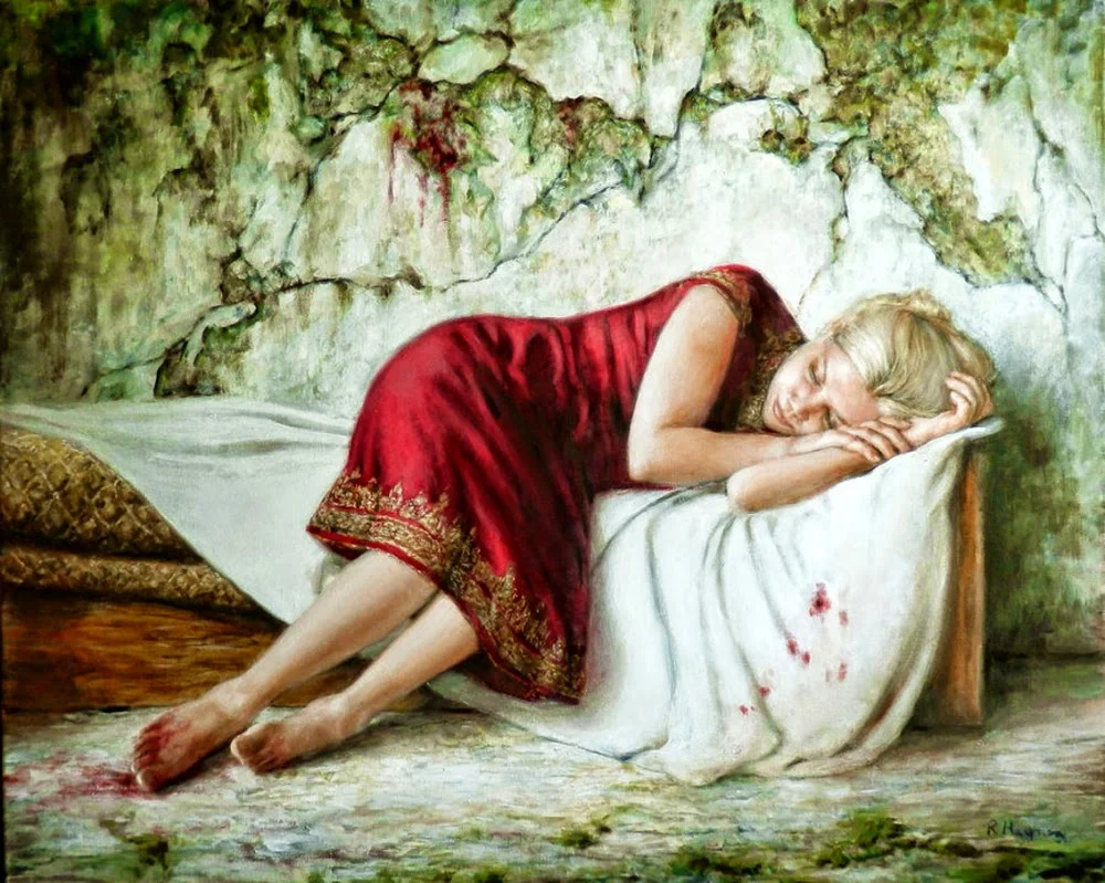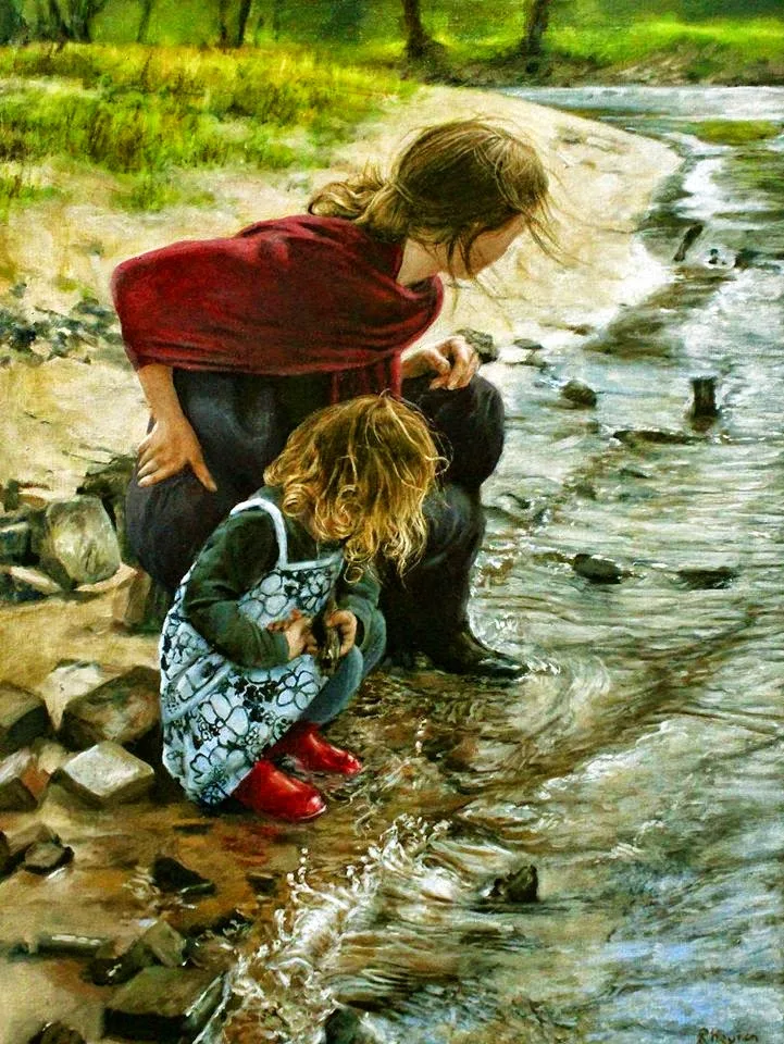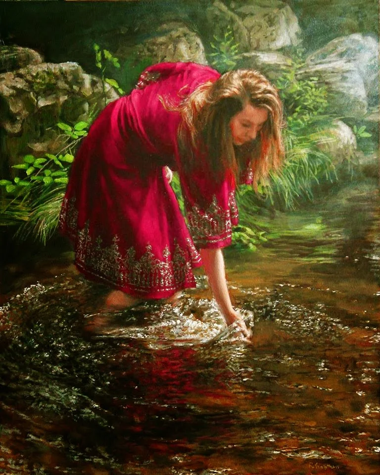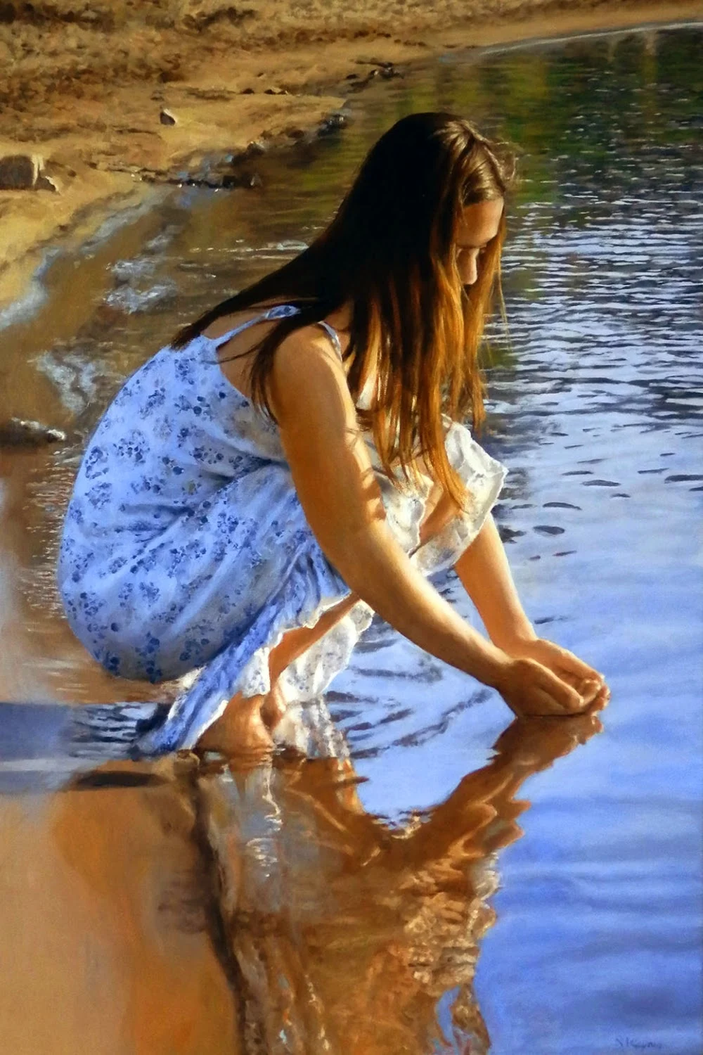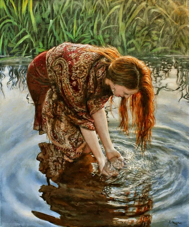 Il riflesso dell'acqua esalta l'immagine della donna introspettiva, un ideale di bellezza in contrasto con la società frettolosa in cui ci troviamo. Ralf mette le sue figure in una posizione di riposo e contemplazione. Non sembra importare cosa sta succedendo intorno a loro poiché sono nei loro pensieri e non comunicano con lo spettatore. La luce e la consistenza giocano un ruolo importante nella composizione.