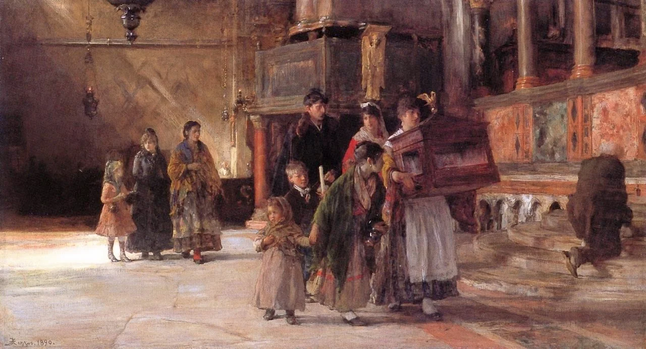 In 1881 at Milan, displayed the paintings: Mercante di ventagli; At the Predica, half-figure di fanciulla; and Popolana. In 1883 in Rome, exhibited: The Lovers. He painted Lettera d'amore, Una fuga nel 1700; and Il molo di San Marco. He sent to Paris in 1877-1878, the paintings: Pigeons of St Mark, El-Mazrama (Mouchoir of the Sultan), Los Saltimbanques, and A venetian - A Daughter of the People.