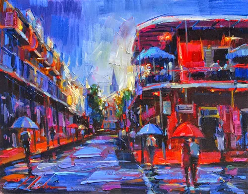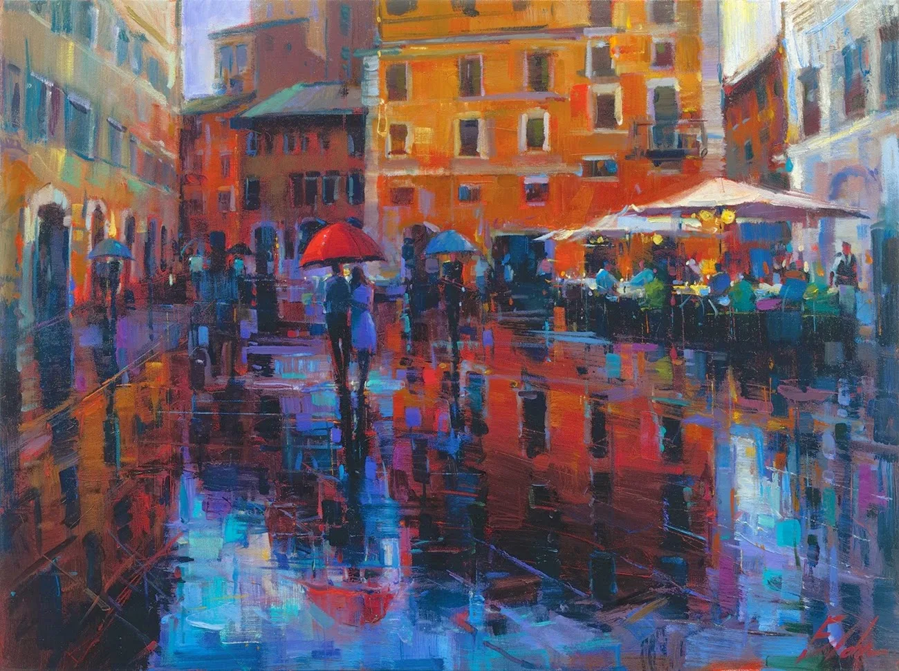 Michael Flohr paints in a style called urban impressionism. His atmospheric street scenes are brilliantly composed with bold color applications and fascinating narrative lines.