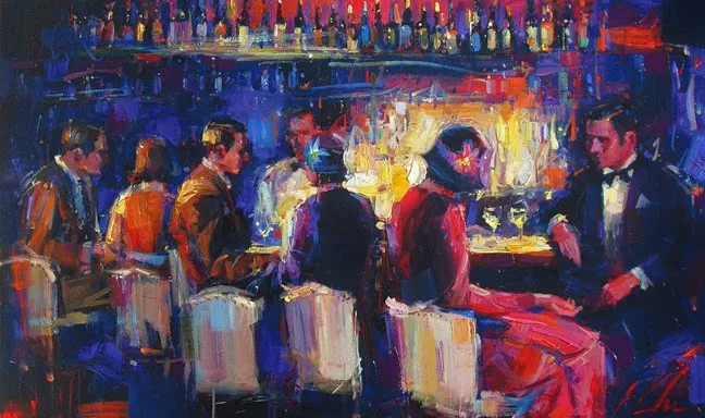 He can be seen around town in nightclubs, bars and cafes, sketchbook in hand, capturing the shifting colors and dynamics of people as they mingle and interact. “I do not work with models. I prefer to sketch ‘in the moment’ as a scene unfolds…” reports Flohr. The artist has recently been commissioned to create an album cover for jazz/swing musician David Patrone, a uniquely apt collaboration.