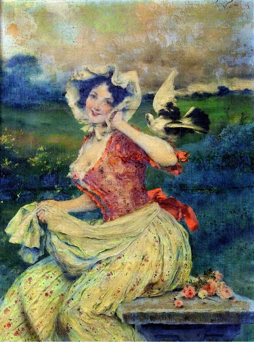Egli, per contro, visse sempre in un sogno del passato: un sogno lieve, giocondo, voluttuoso, che gli popolava la fantasia delle vivaci e graziose figurine, si maestrevolmente disegnate nelle sue tele ed illuminate da tanta letizia di colori.