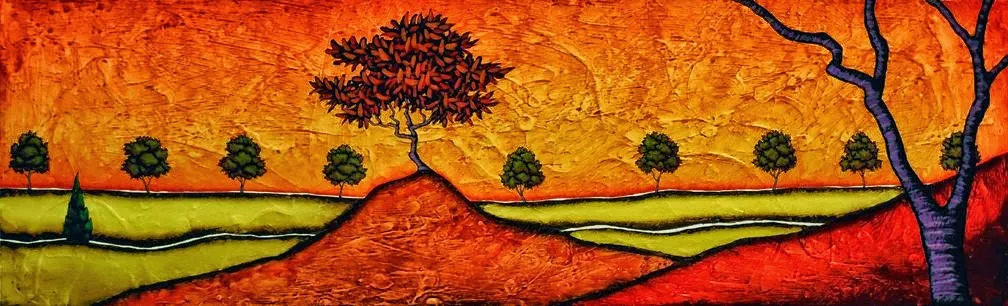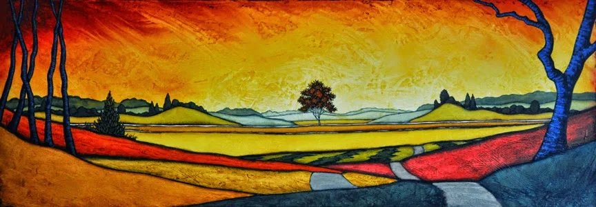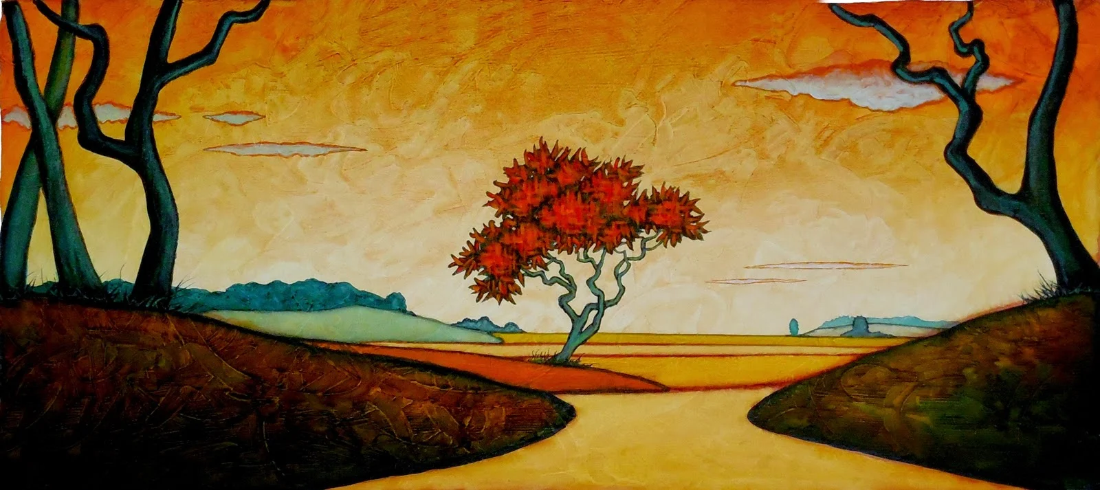 My work has its own visual vocabulary that helps evoke the emotion that I am trying to convey rather than a sense of specific place. I have become well known by collectors for my signature Red Trees as well as several other series that include Red Roofs, Red Chairs and the Archaeology series of recent years.