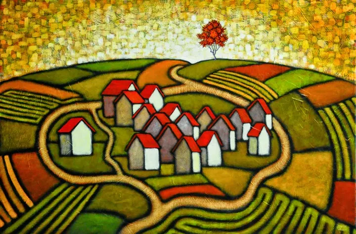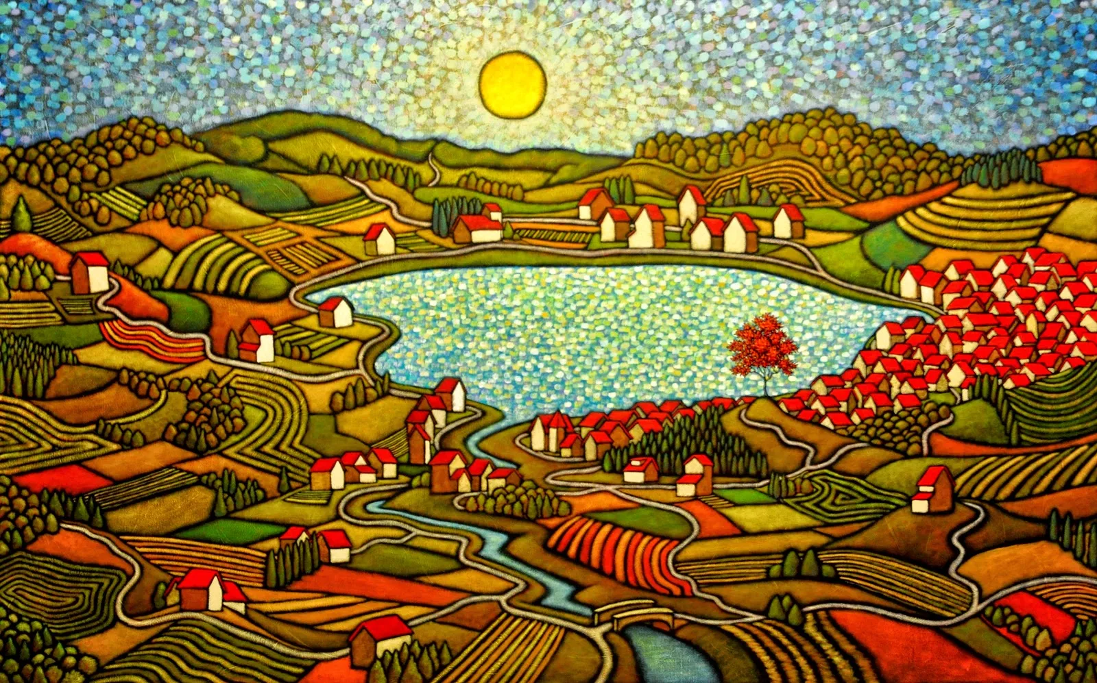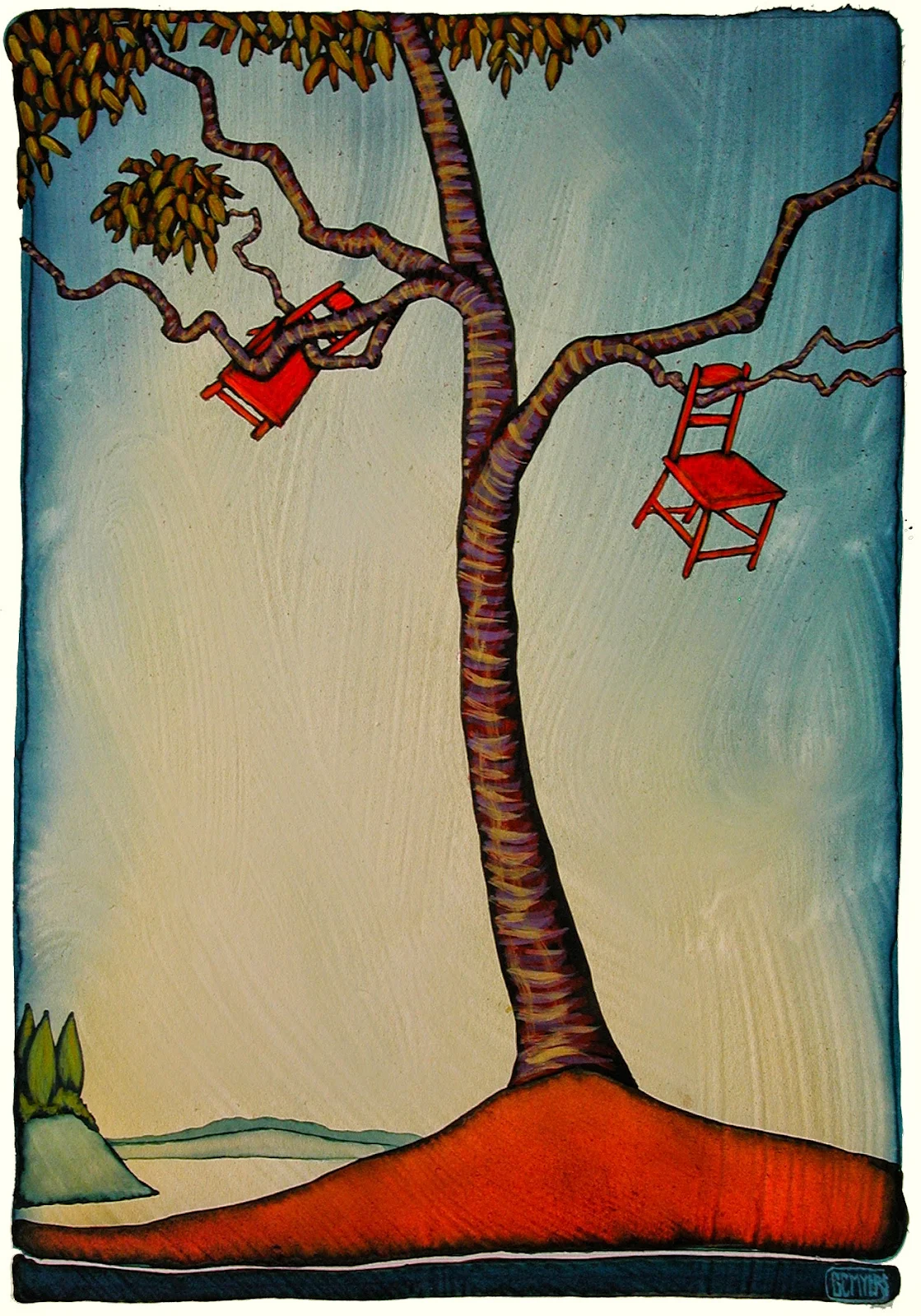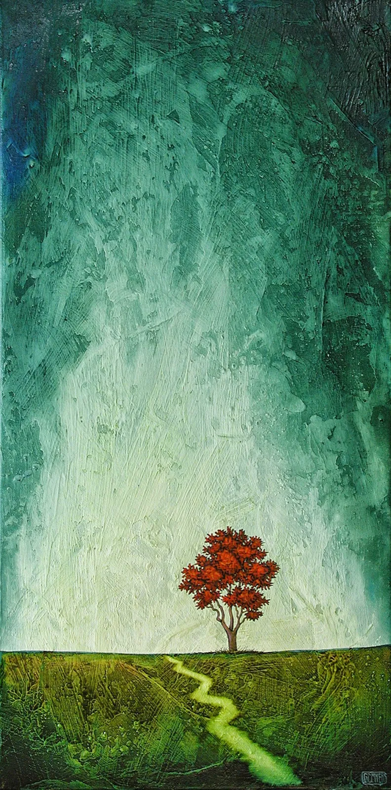 A self-taught painter GC Myers, is a modern painter of “internal” landscapes, evocative compositions that reflect the synthesis of numerous schools of influence- Eastern philosophy, American Regionalist and Modernist paintings, Abstract-Expressionism, Art Nouveau and on and on. His ability to draw from many and diverse sources results in a world of creation that is truly unique, speaking with a vocabulary that is, at once, both personal and universal. Myers’ use of simplistic design, bold coloration and stylized rendering transforms the natural landscape into one that resonates with human emotions and qualities.