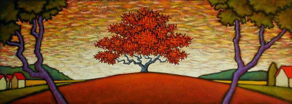 My work has its own visual vocabulary that helps evoke the emotion that I am trying to convey rather than a sense of specific place. I have become well known by collectors for my signature Red Trees as well as several other series that include Red Roofs, Red Chairs and the Archaeology series of recent years.