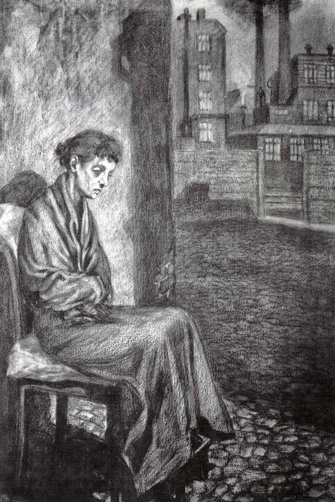 For example, his 1894 work Noon (Mittag) depicts women with children bringing lunch baskets to their men employed at the factories, and evokes the "endless drudgery" of working-class life, with its constant repetition of daily tasks.