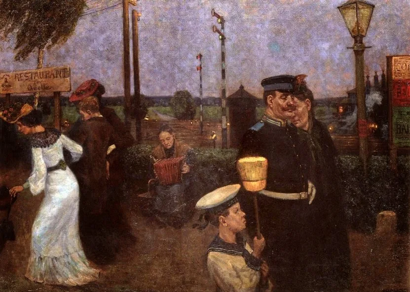 With Railwayman's Evening Free (Eisenbahner-Feierabend) in 1895, this theme is represented by an individual worker who returns exhausted from work against a backdrop of railroad installations, smoke stacks and overhead tram wires, and is greeted by anxious children.