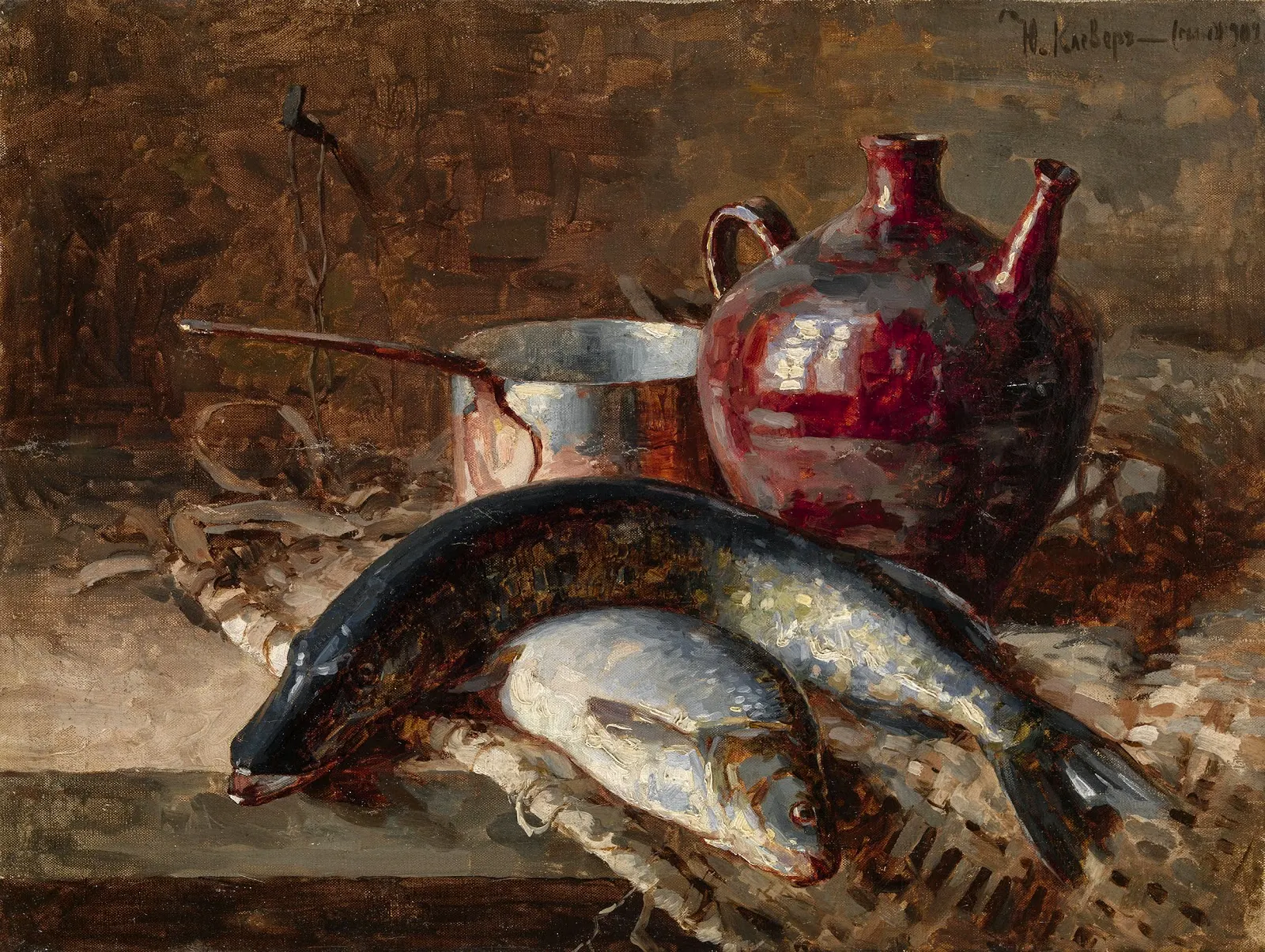Юлийлий Юлиевич Клевер [1850-1924] painter and teacher. Born to German parents in Dorpat (now Tartu) in Estonia, 1850. Studied under Constantin von Kügelgen in Dorpat (1866-67) and under Sokrat Vorobyov and Baron Mikhail Konstantinovich Clodt von Jürgensburg at the Imperial Academy of Arts (1867-70, expelled). Founding member of the Society of Exhibitions of Works of Art (1874). Academician (1878), professor (1881). Organised the Russian sections at the Exposition Universelle in Antwerp (1885) and the Jubiläums-Ausstellung der Königlichen Akademie der Künste in Berlin (1886, gold medal).